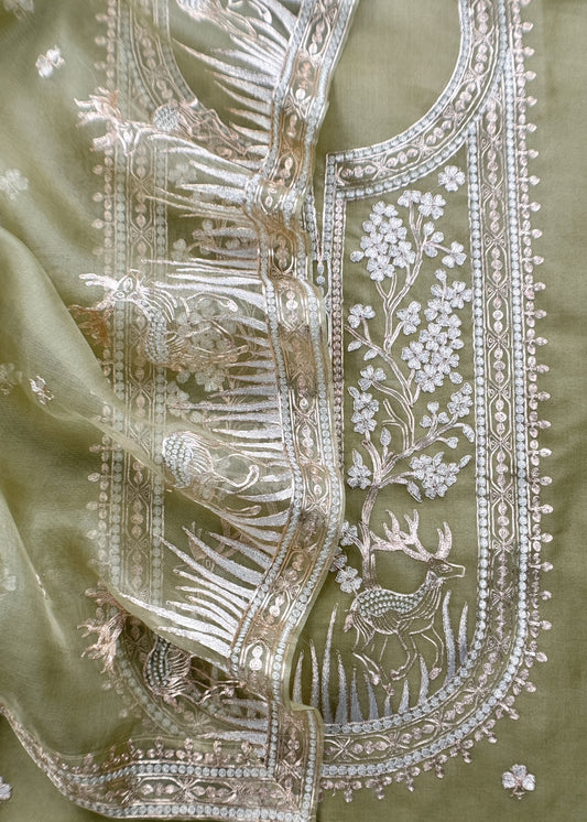 Luxe The Green Pure Kora Silk Suit With Gold And Silver Pitta Handwork
