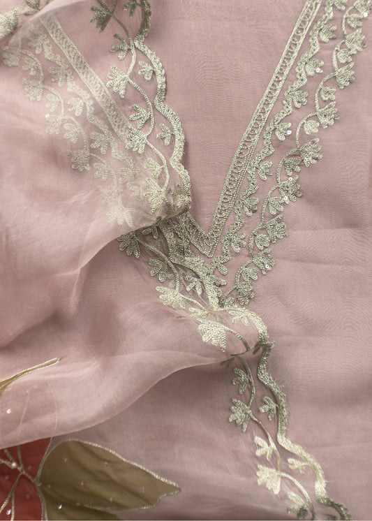 Pink Hand Painted Organza Silk Suit With Dori Embroidered