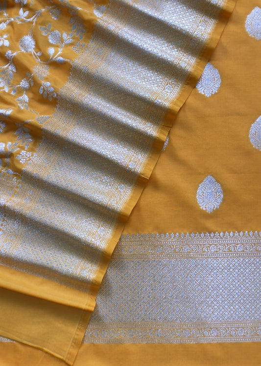 Kalasheel Luxe Handwoven Yellow And Saffron Banarasi Silk Suit With Zari Weaving