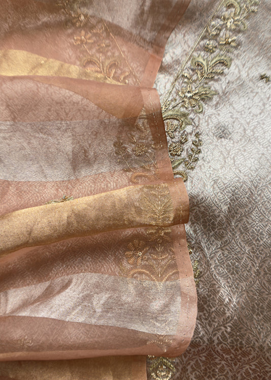Peach Varanasi Brocade Silk Kurta And Double Panel Tissue Dupatta With Handwork