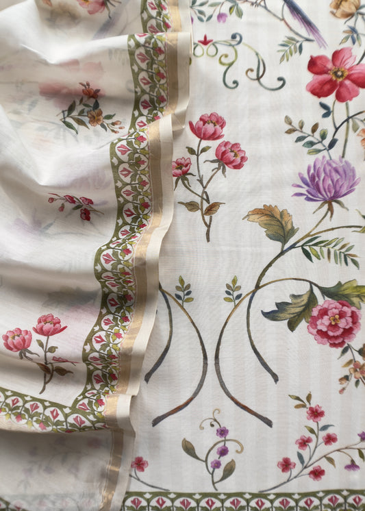 Ivory White Royal Handloom Jaipuri Print Maheshwari Suit