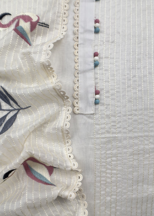 Off White With Yellow Pink Embroidered Mul Chanderi Unstitched Suit