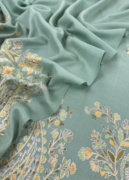 Turquoise Unstitched Woolen Suit With Aari Embroidery work