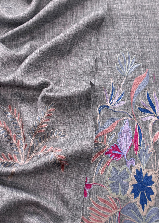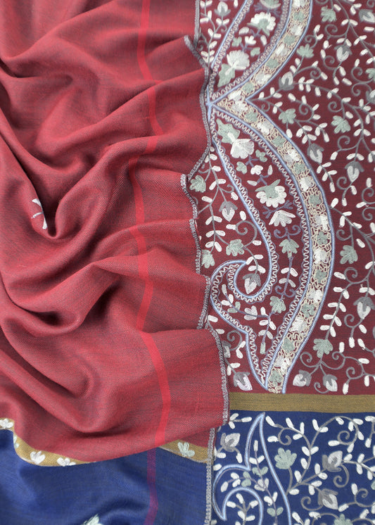 Blue And Red Grey Pure Merino Wool With Beautiful Aari Embroidery
