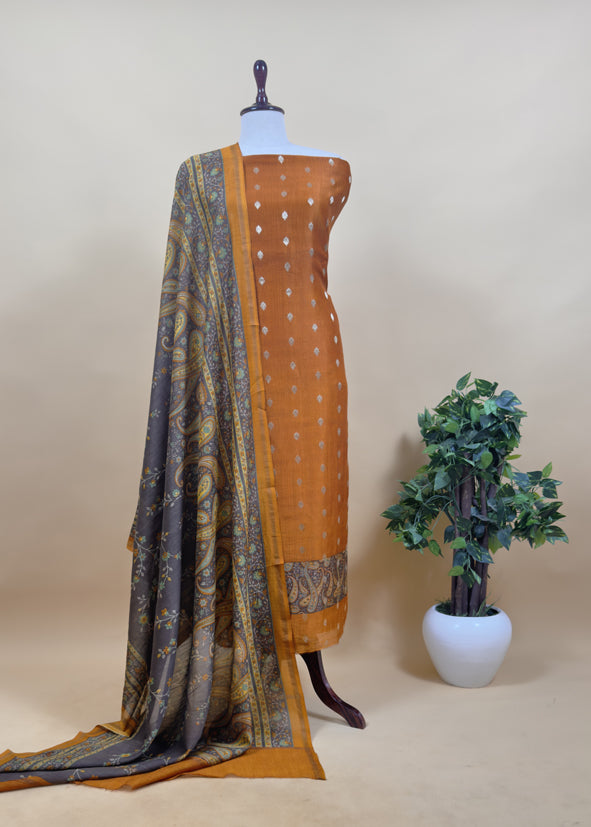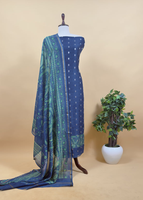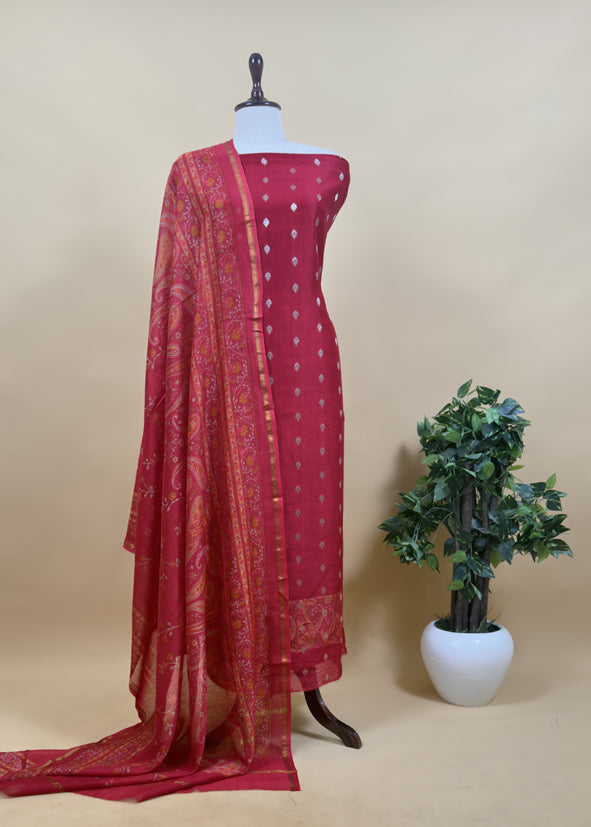 Presenting our bestseller unstitched three-piece suit set in handcrafted pure Maheshwari Silk fabric. The maheshwari silk kurta features traditional print with subtle gold banarasi bootis all over it paired with contrast Maheshwari Silk dupatta with traditional motifs and zari borders. The suit comes with fine quality matching bottom