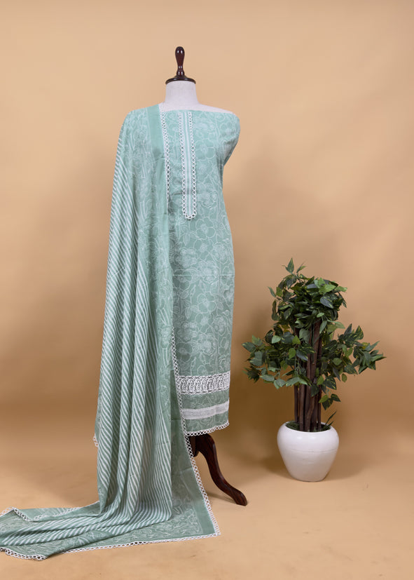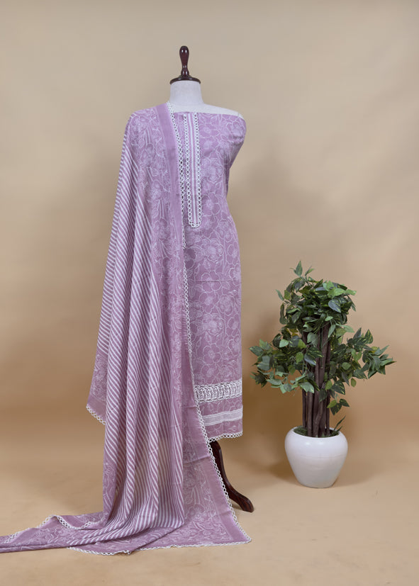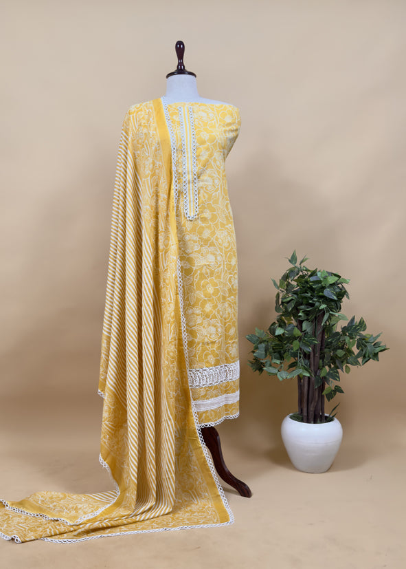 Crafted in pure mulmul cotton, this elegant suit features delicate hand-block prints all over the kurta, highlighted with lace detailing on the neckline and ghera. It is paired with a pure cotton dupatta adorned with crochet lace borders and a striped cotton bottom.