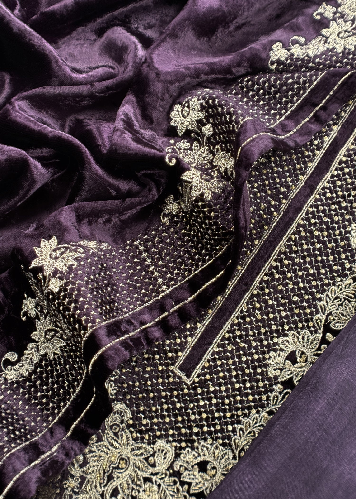 Designer brocade silk kurta with velvet silk dupatta with stunning embroideries on the neckline and four side borders with matching lowers.