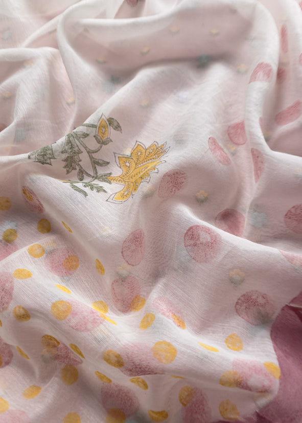 All-over thread embroidered bootis on the kurta and dupatta in summer handloom mul fabric, featuring a beautiful hand-block floral print on the dupatta and a four-side scalloped border. The three-piece suit comes with a matching mul cotton bottom.