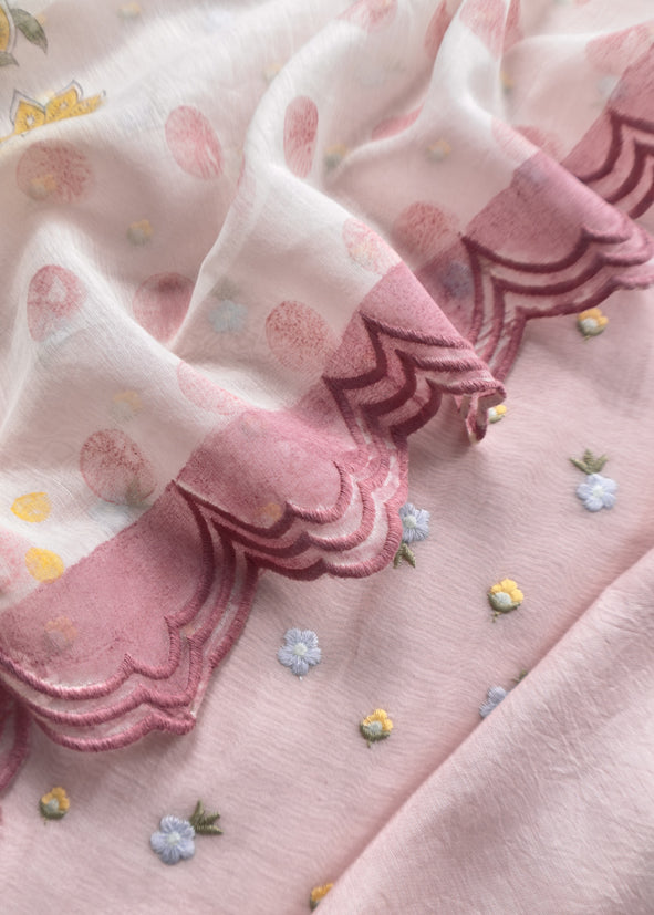 Baby Pink Embroidered Unstitched Mulmul Suit With Scalloped Border.