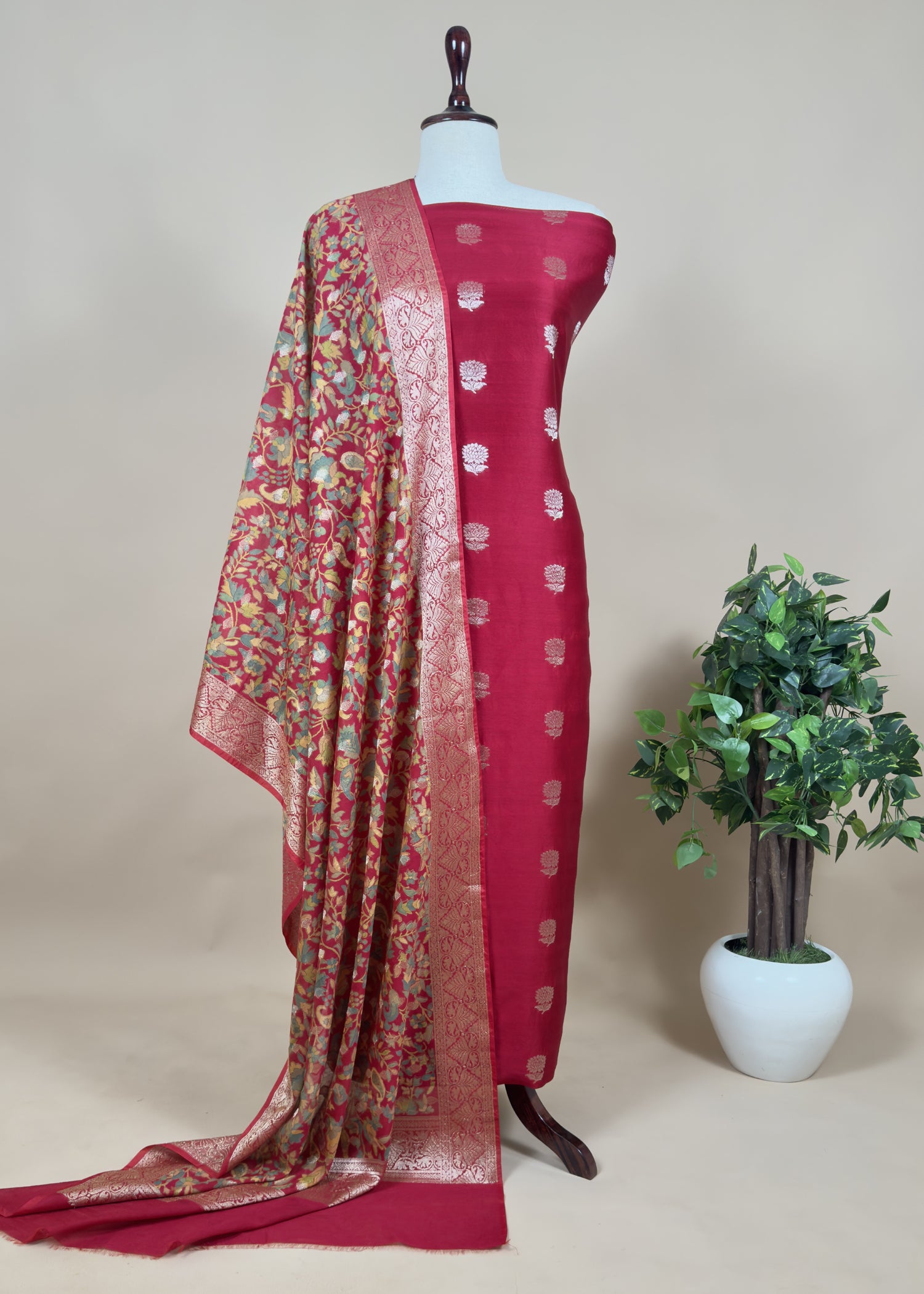 Banarasi Unstitched Suit In Chanderi adorned with exquisite Zari Bootis, paired flawlessly with a mesmerizing Kalamkari Dupatta and Plain bottom.