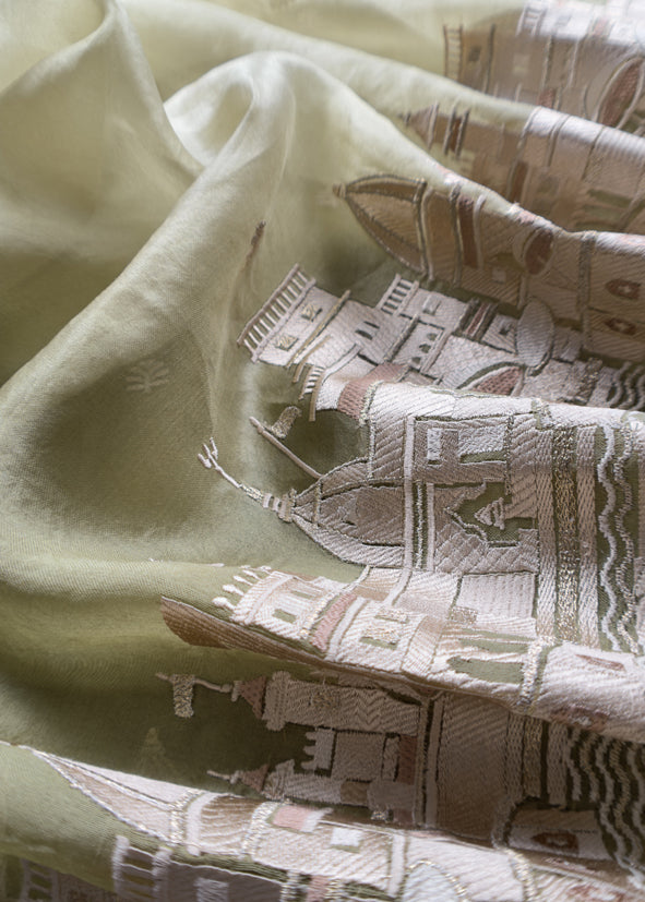 Basil Green Kashi Ghat Embroidered Organza Silk Suit Fabric