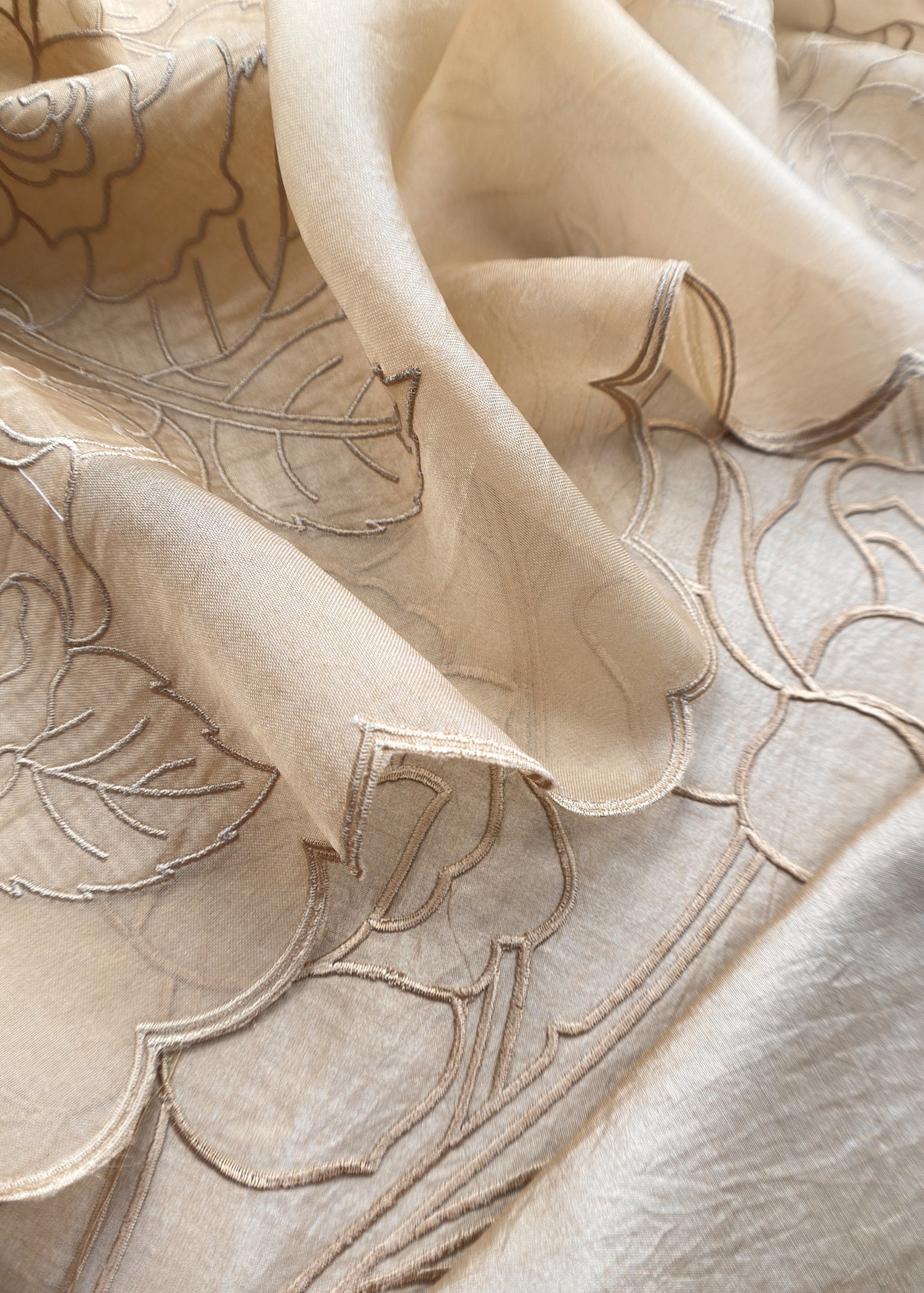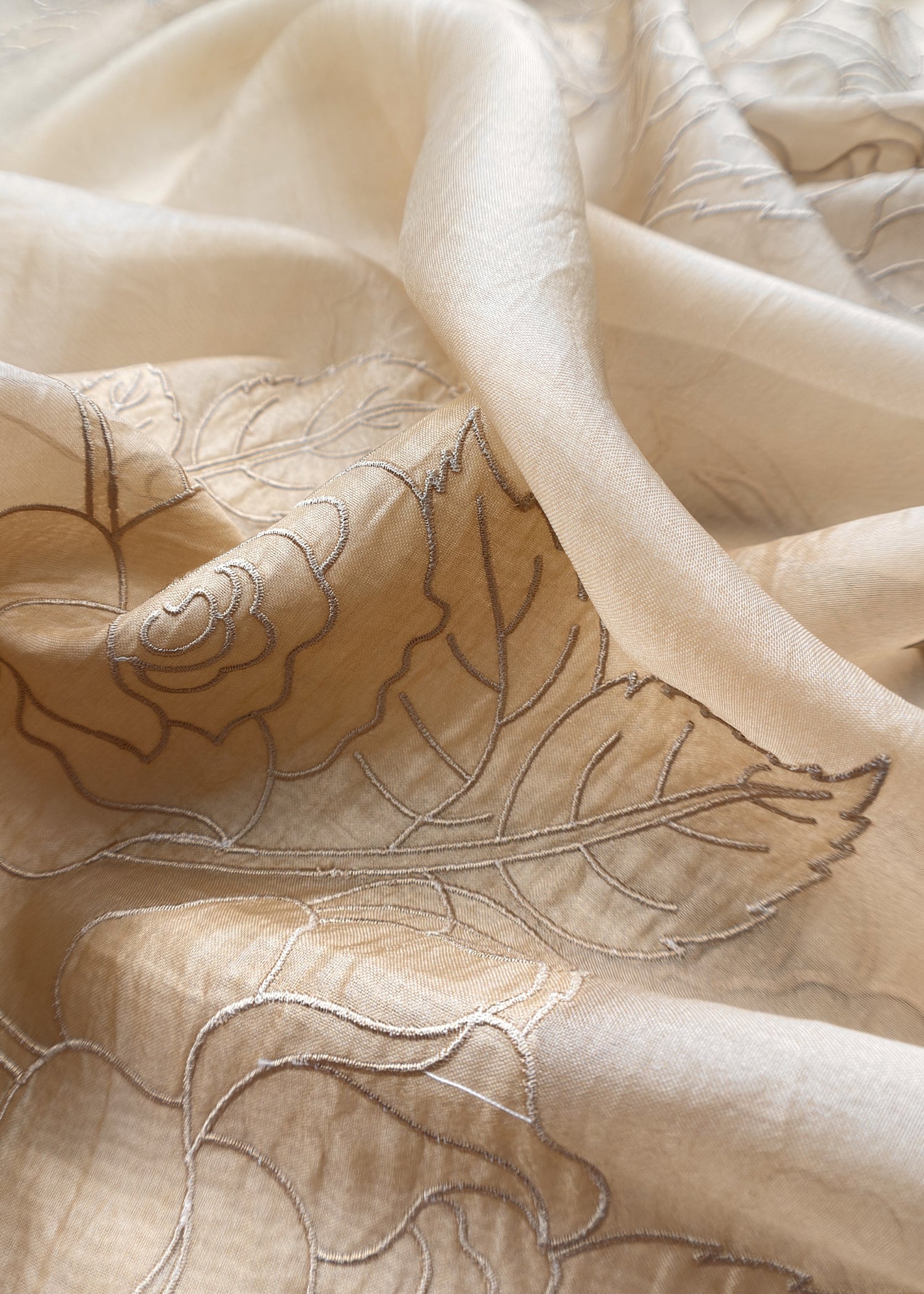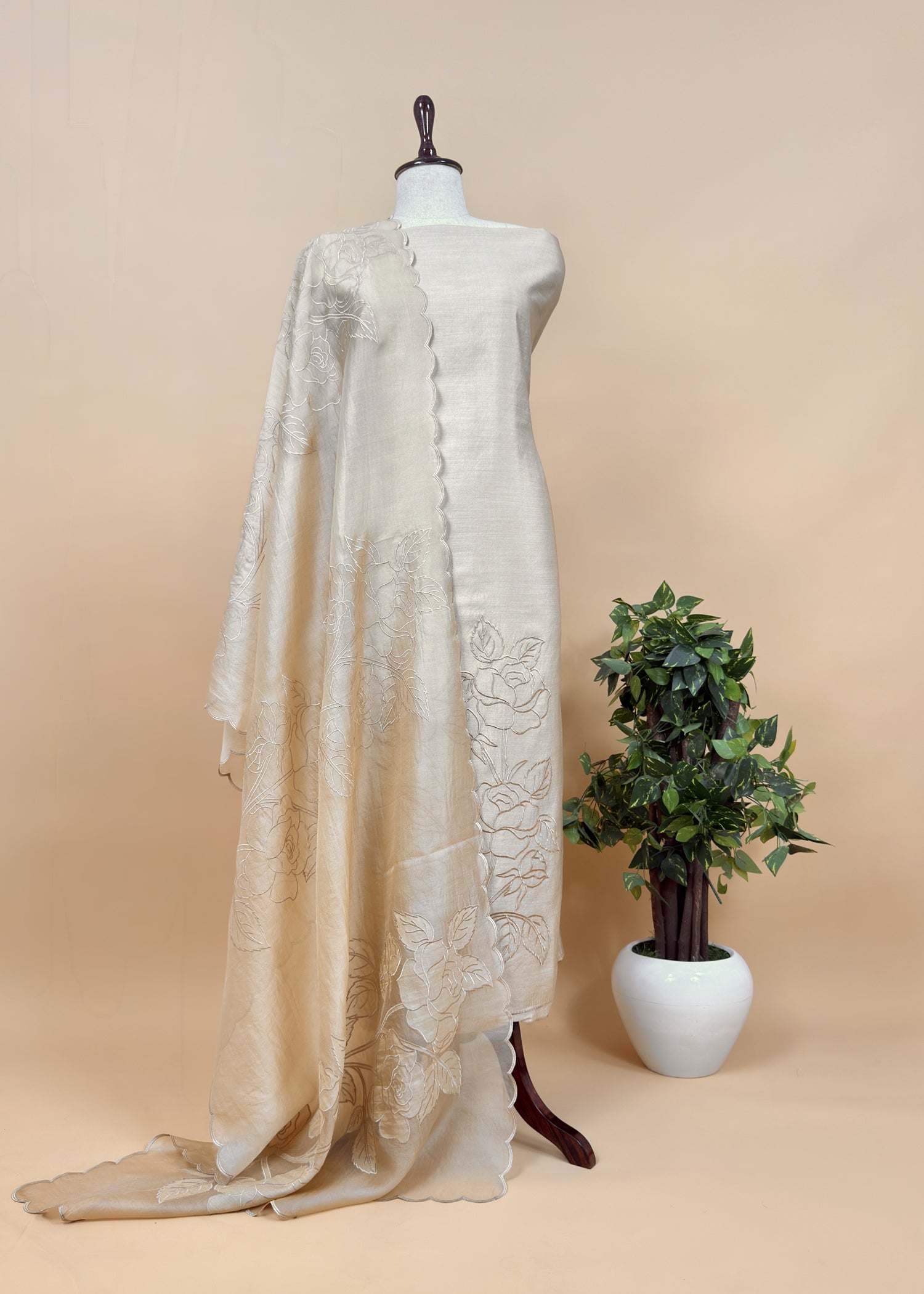 Beige French Roses Pure Silk Kurta And Kora Silk Dupatta With Appliqué Work