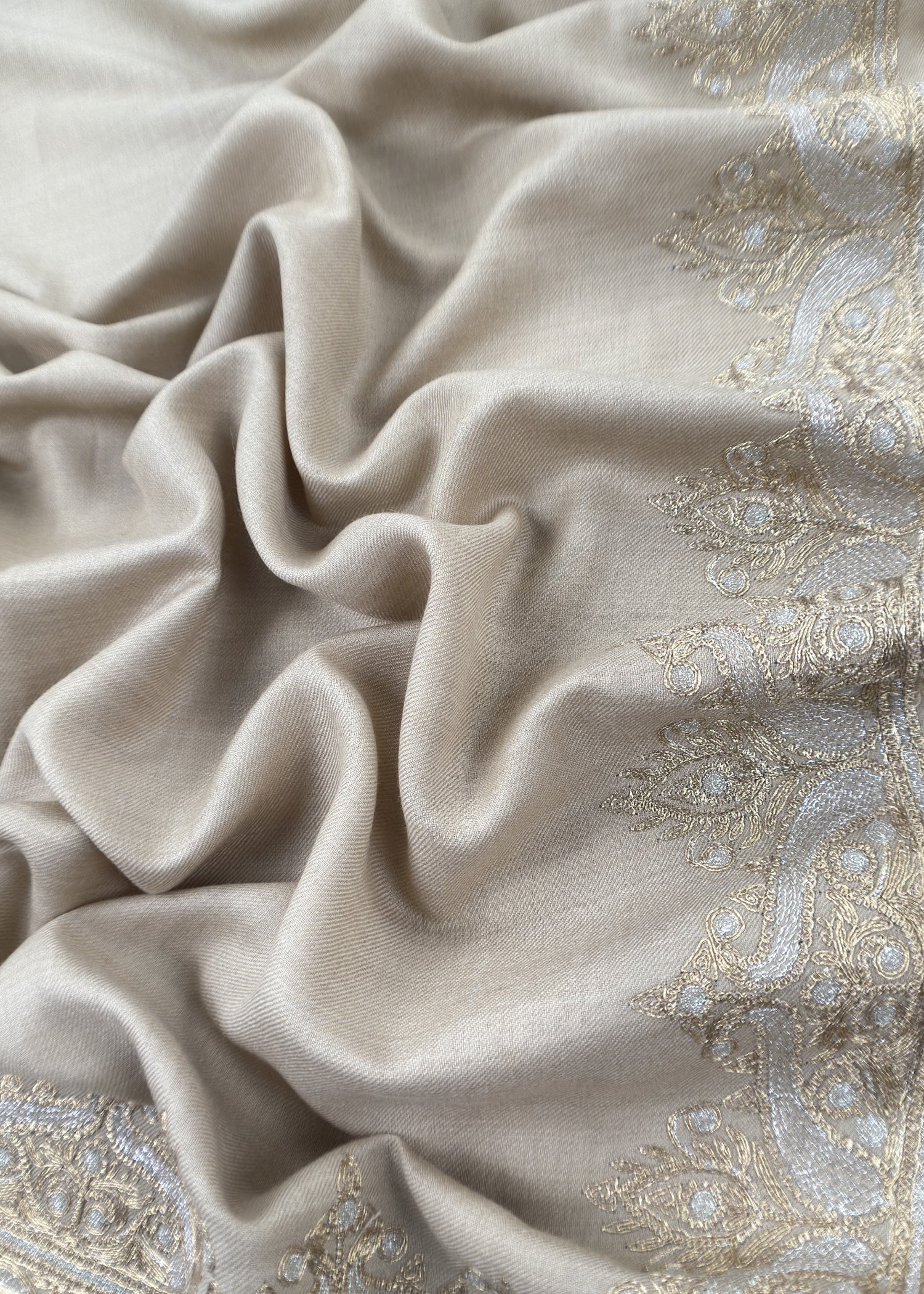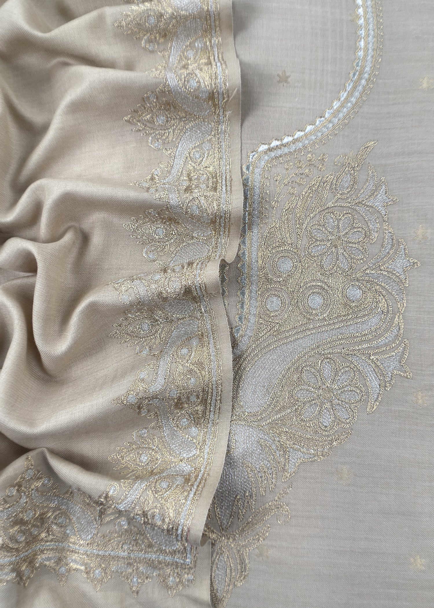 Unstitched three piece woolen suit embraced with beautiful Aari Zari embroidery is complimented with pure wool bottom.