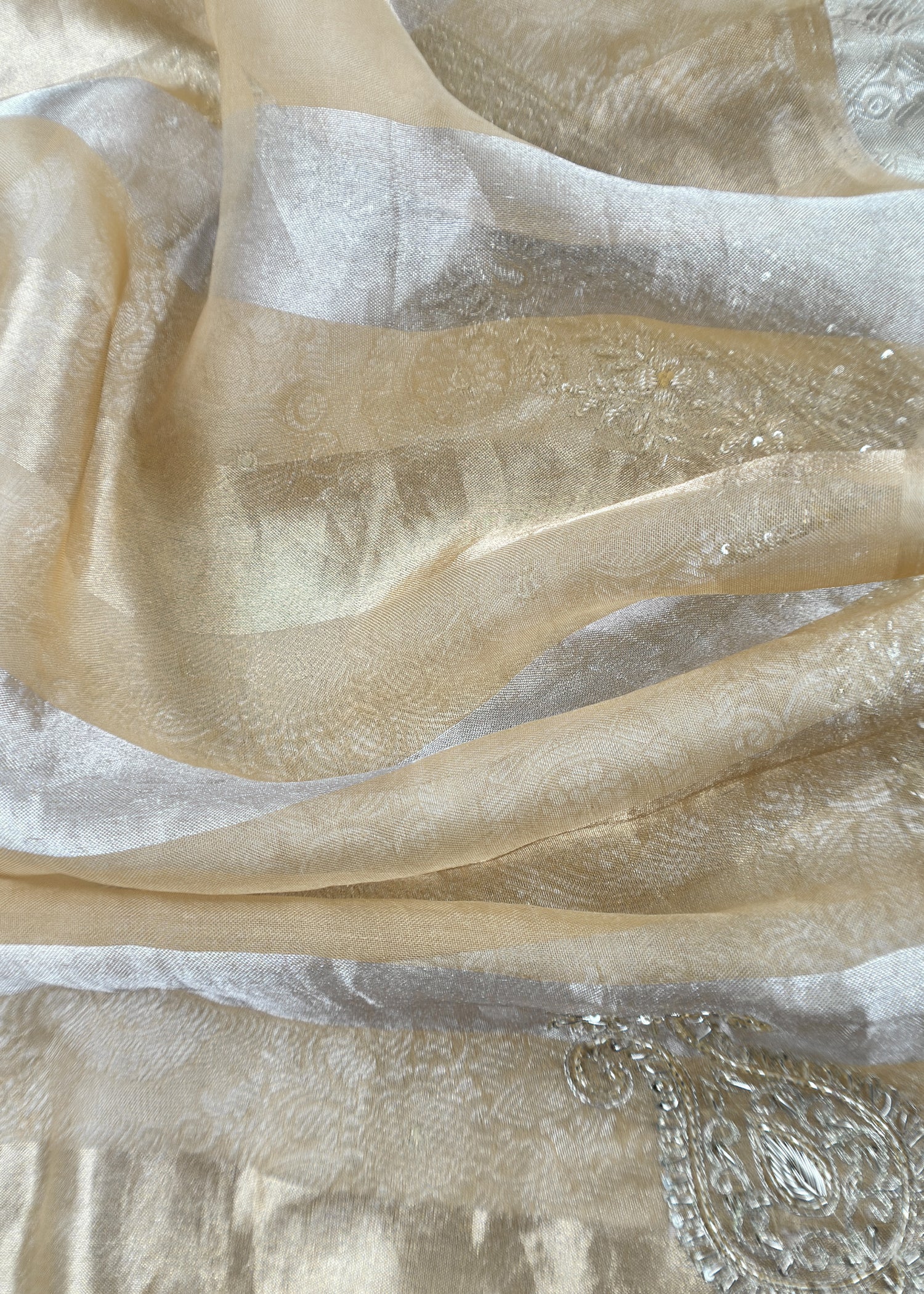Beige yellow Handloom Brocade Tissue Silk Suit With Dabka, Dori, Zardosi Handwork