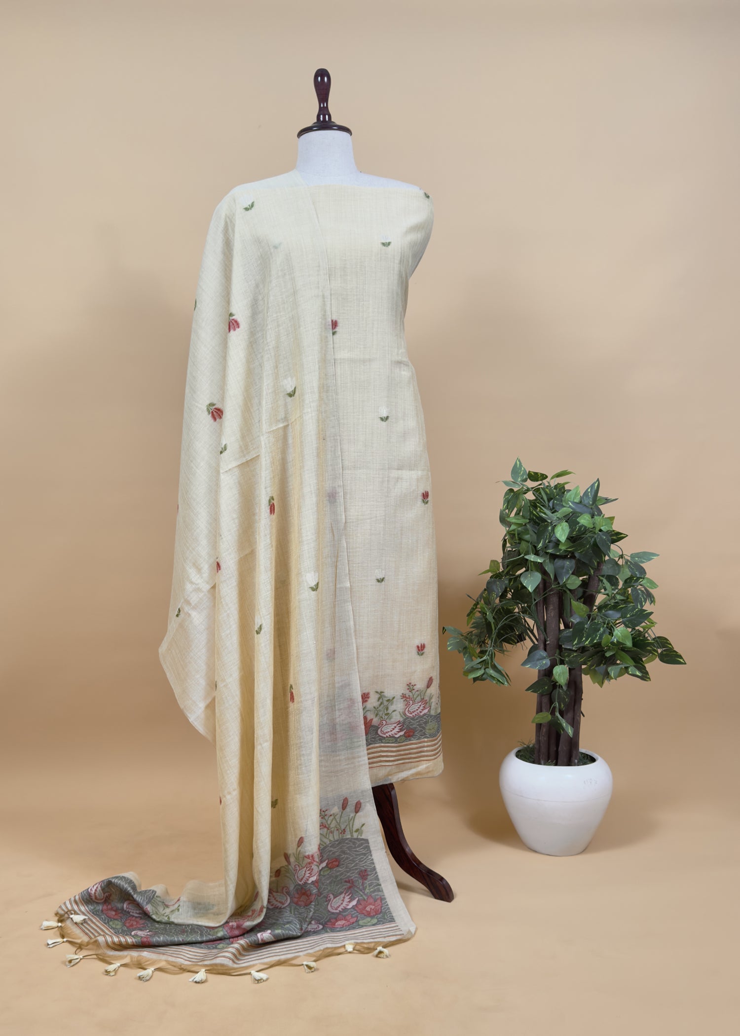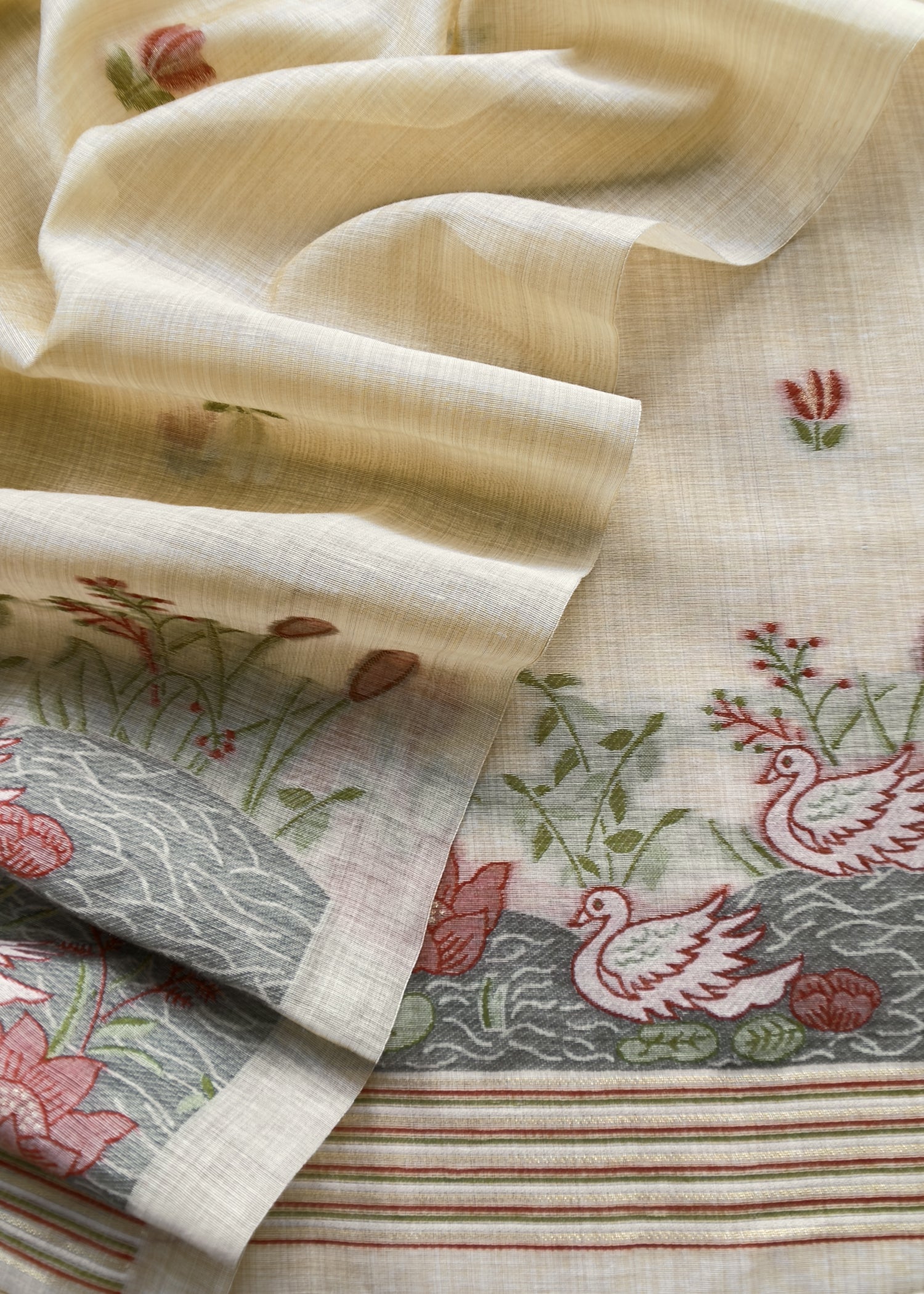 Beige Yellow Lotus And Swans Jamdani Suit In Linen Chanderi