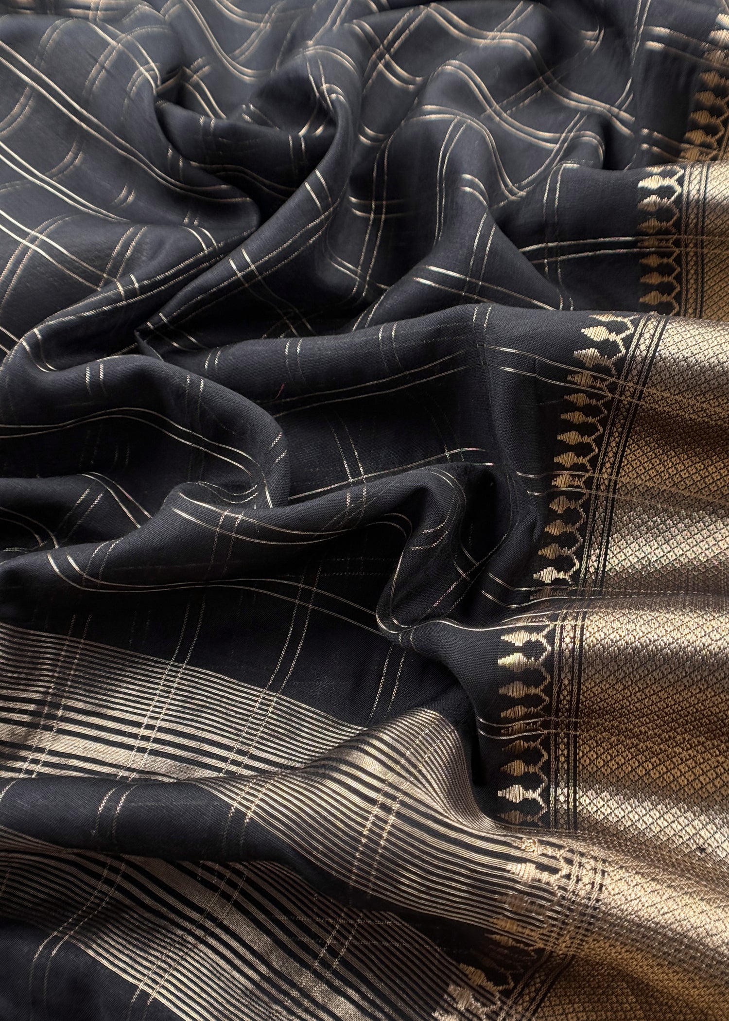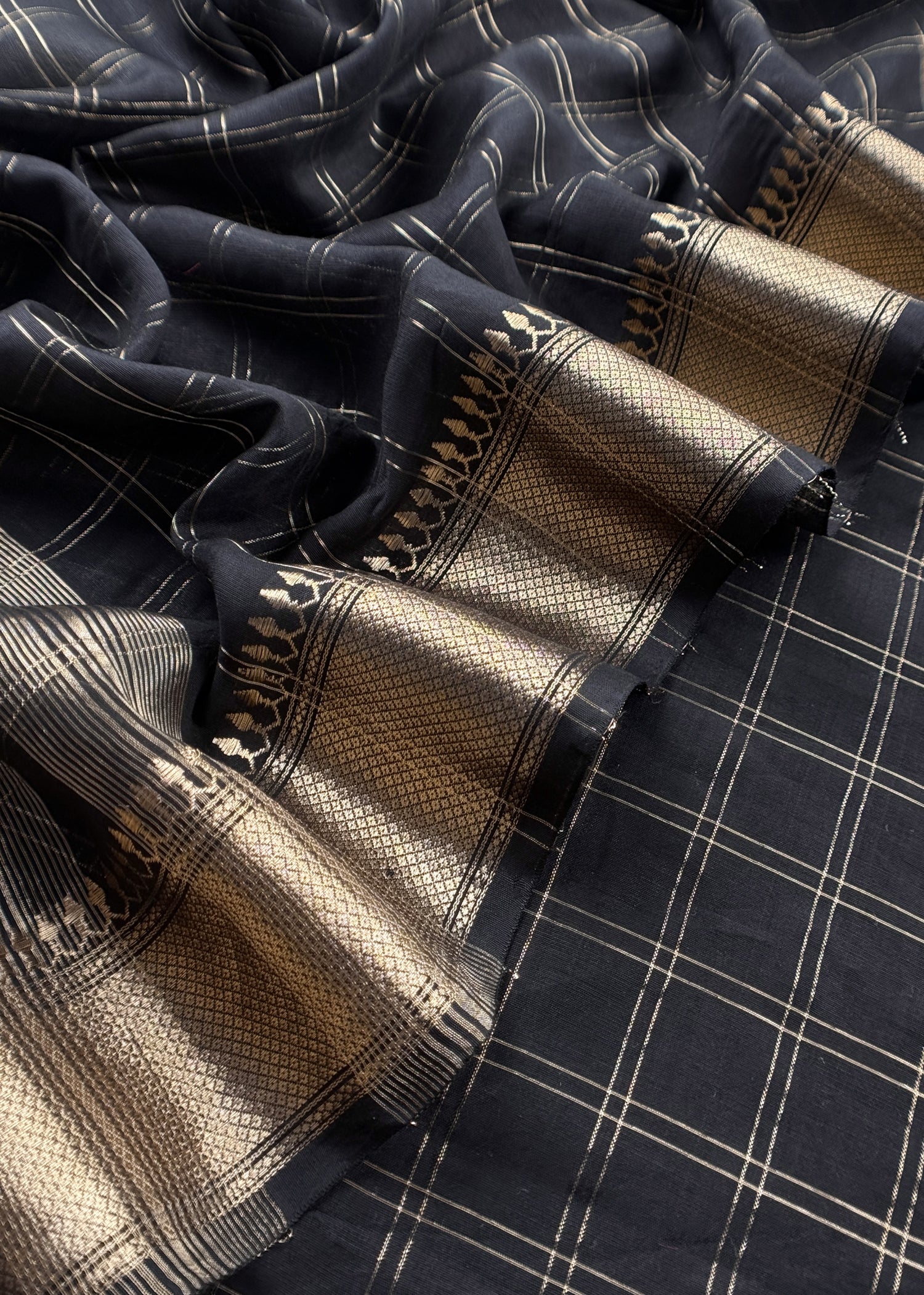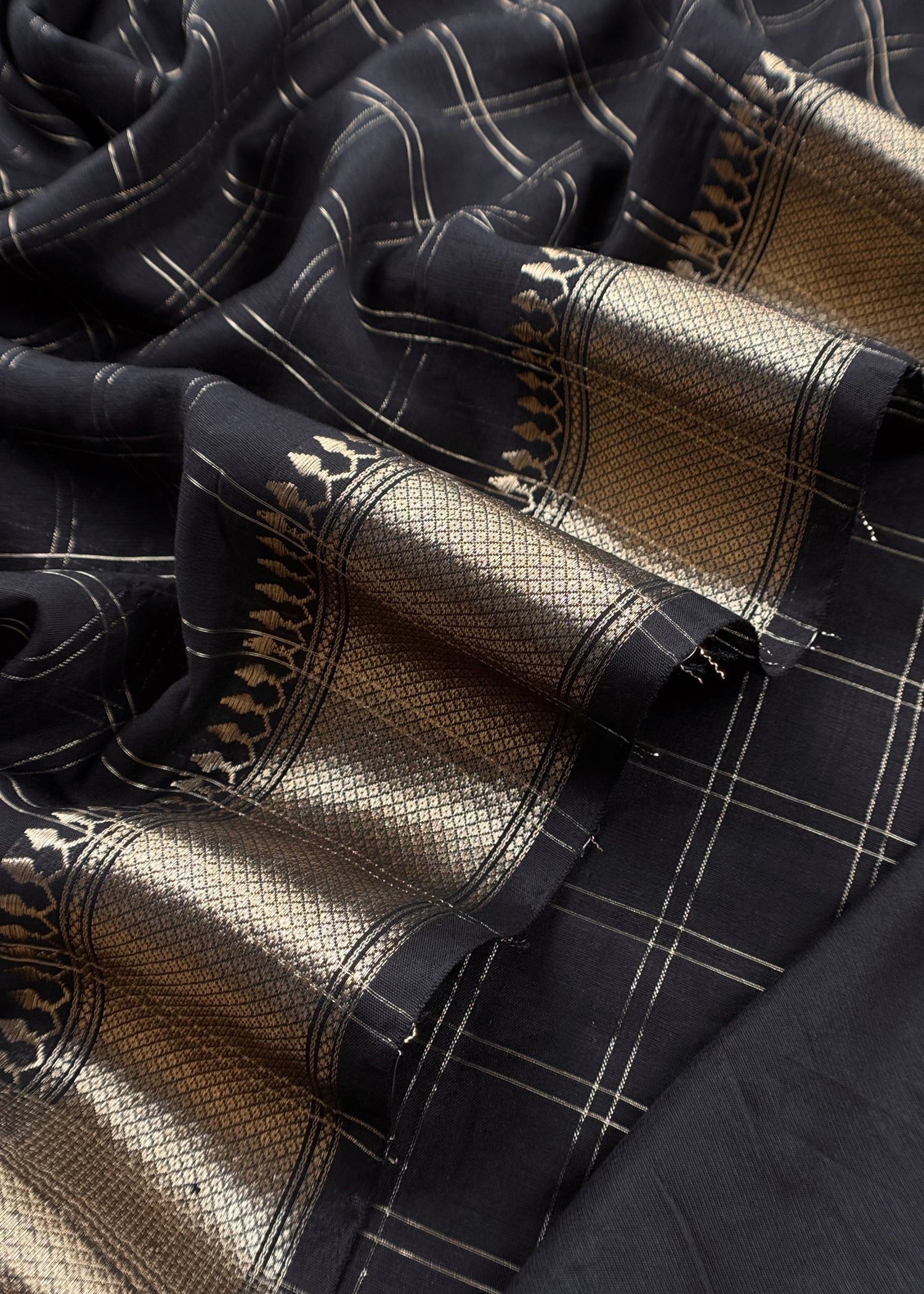 Shop gorgeous Banarasi suit in Chanderi silk kurta with check gold weaving paired with dupatta adorned with elegant Banarasi Zari border. The unstitched three piece suit fabric comes with matching cotton silk lowers.