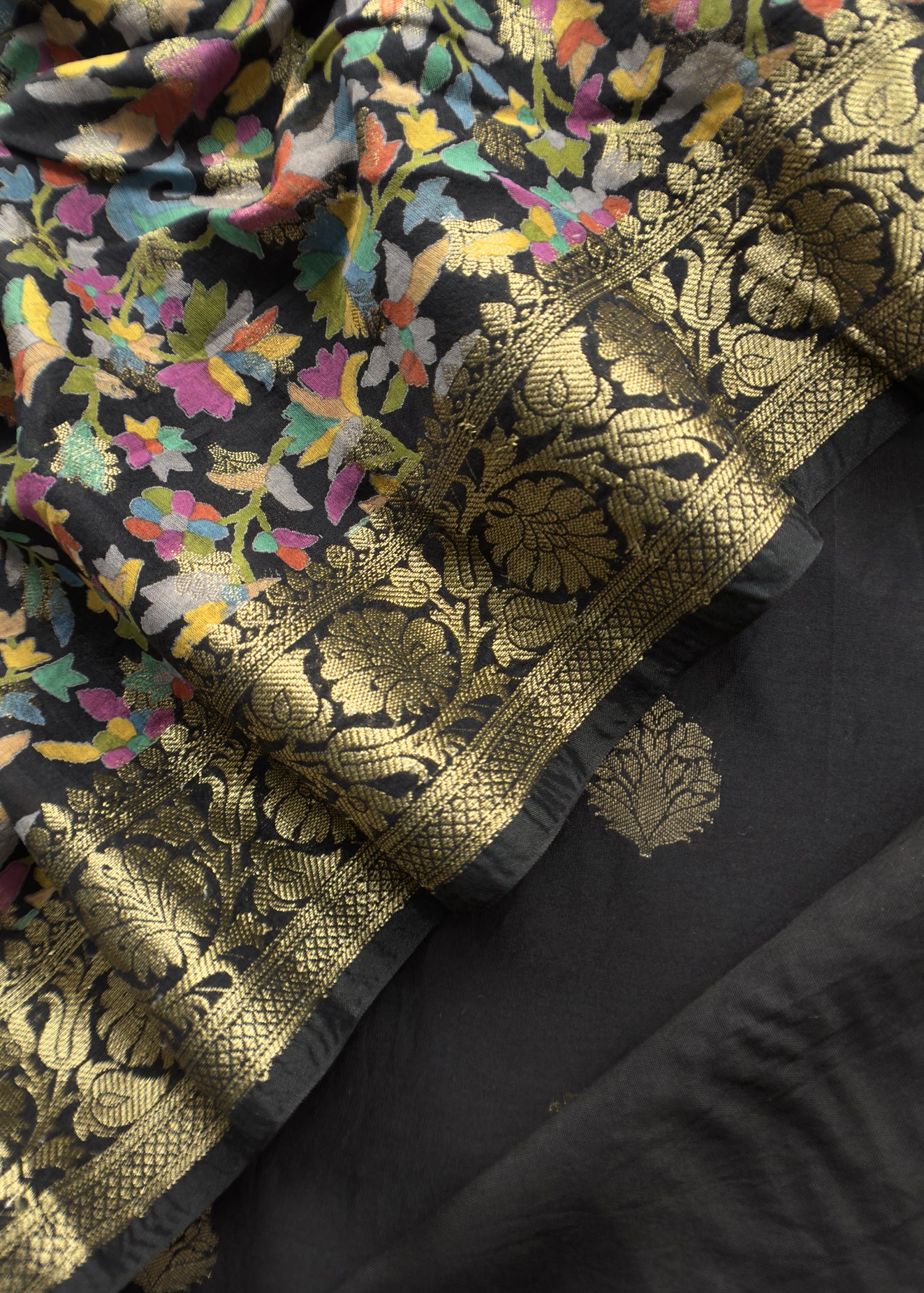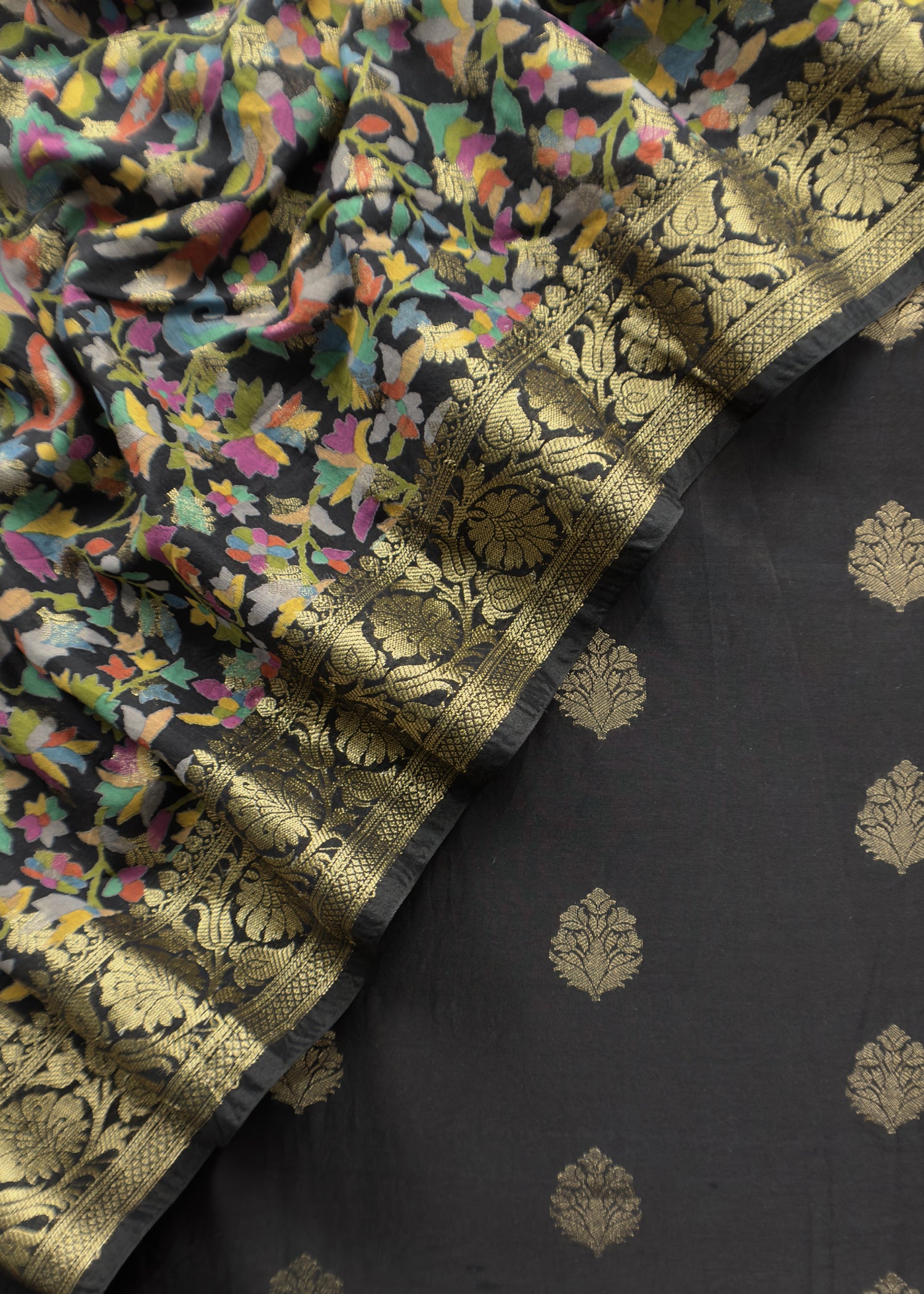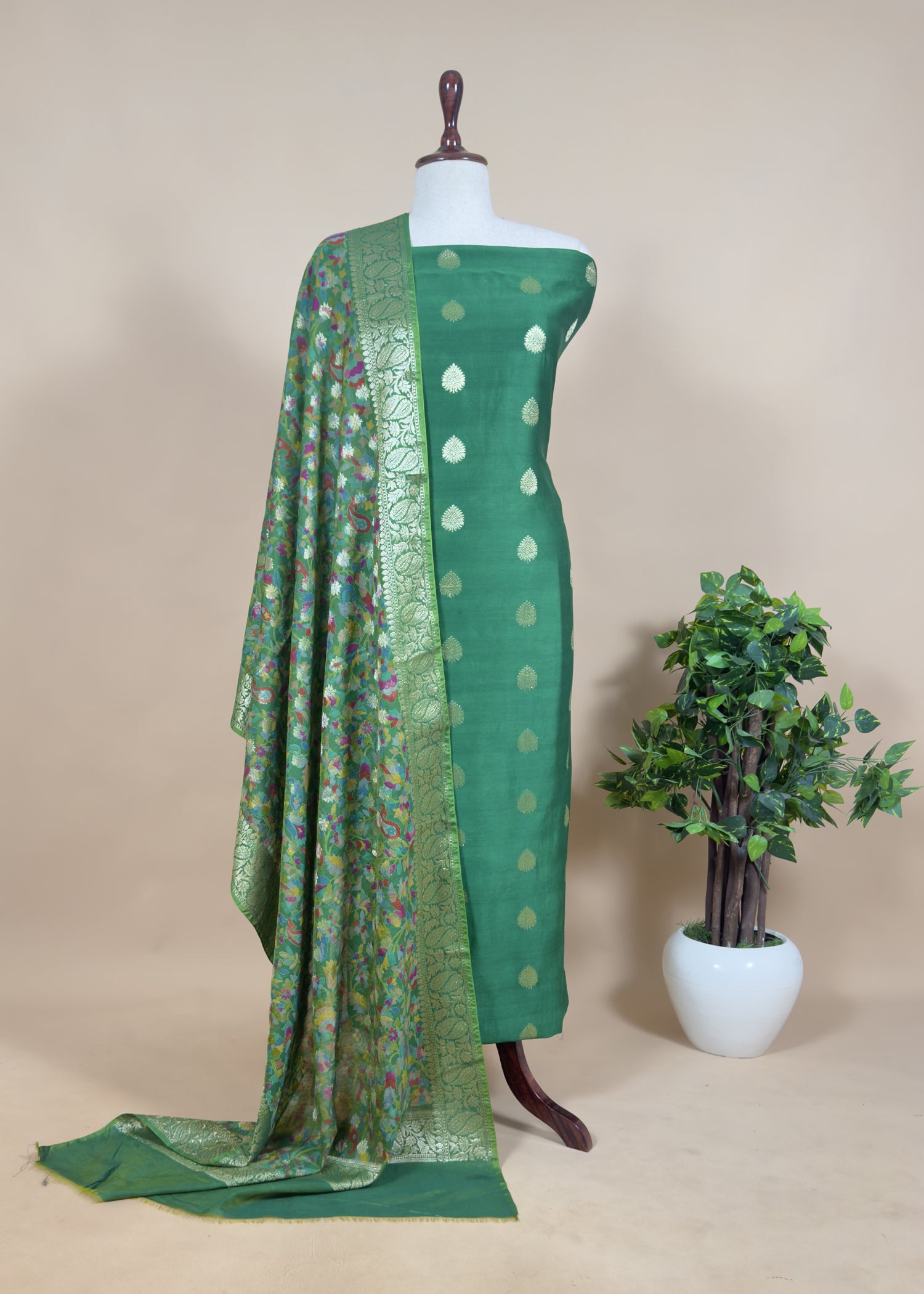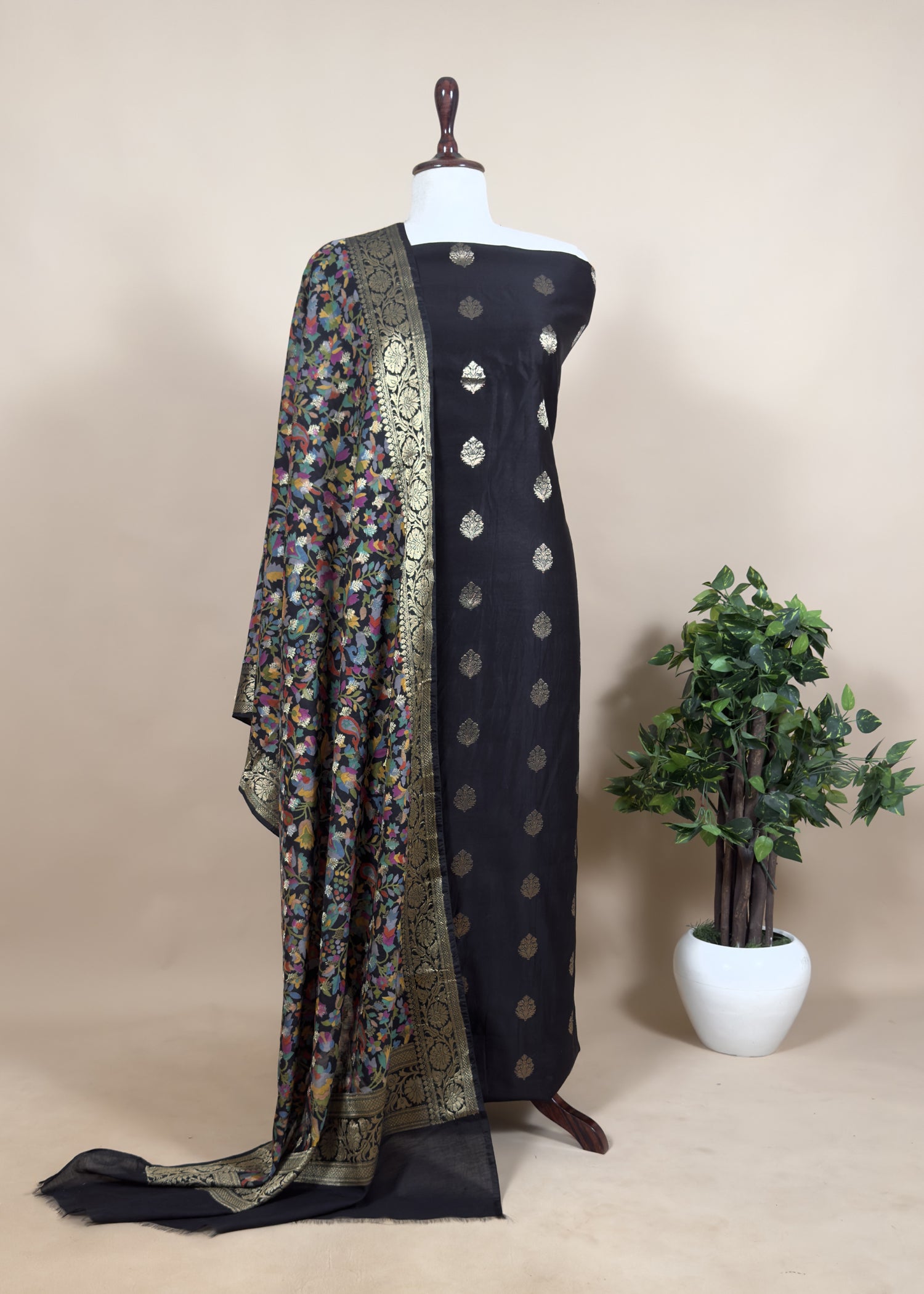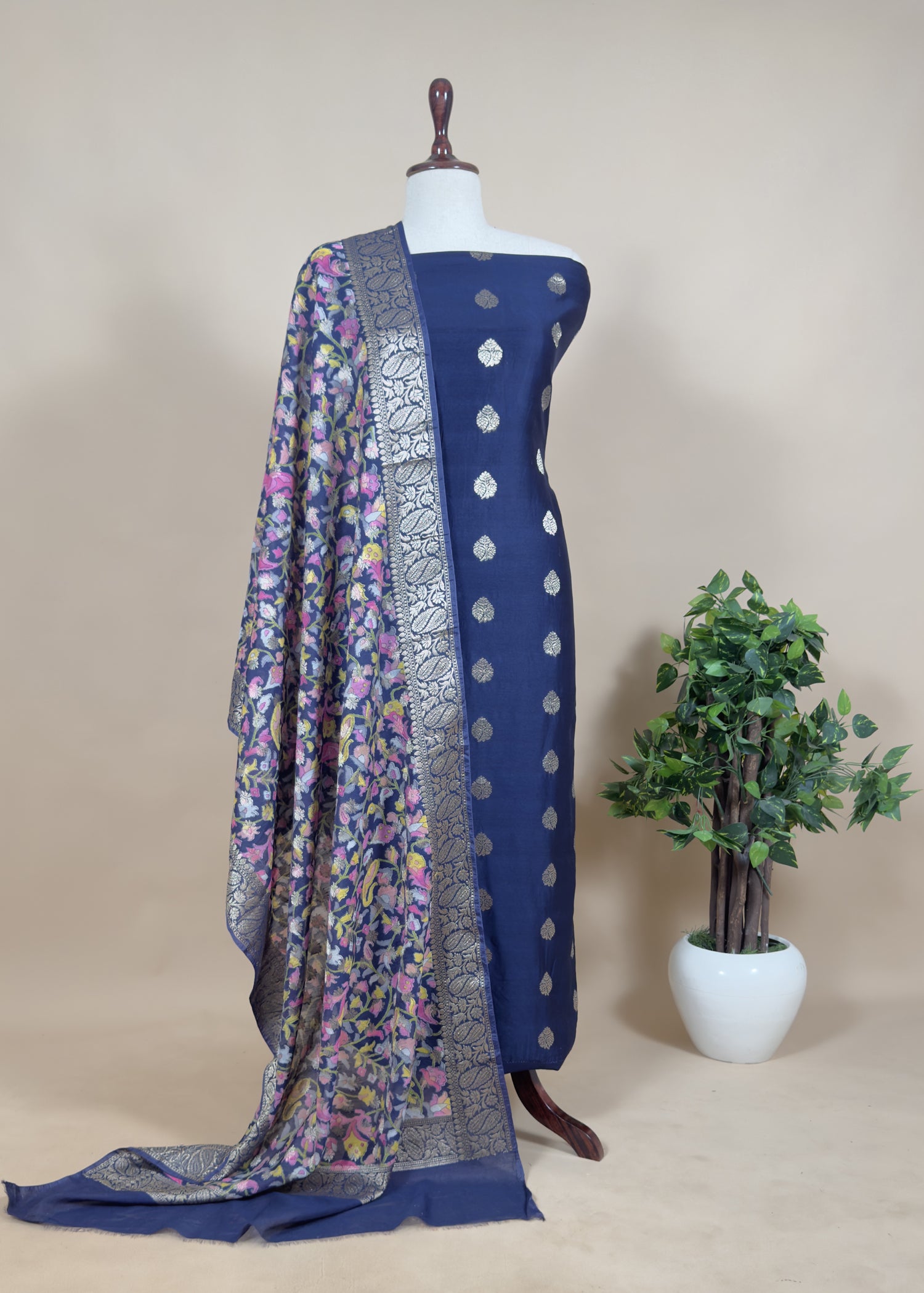 Banarasi Unstitched Suit In Chanderi adorned with exquisite Zari Bootis, paired flawlessly with a mesmerizing Kalamkari Dupatta and Plain bottom.