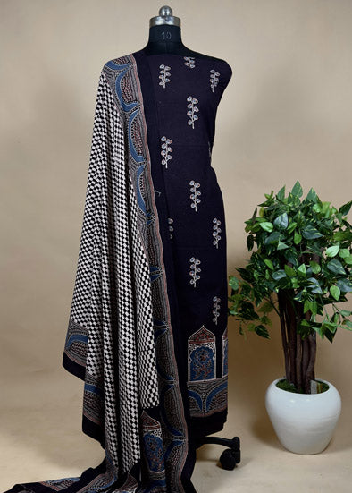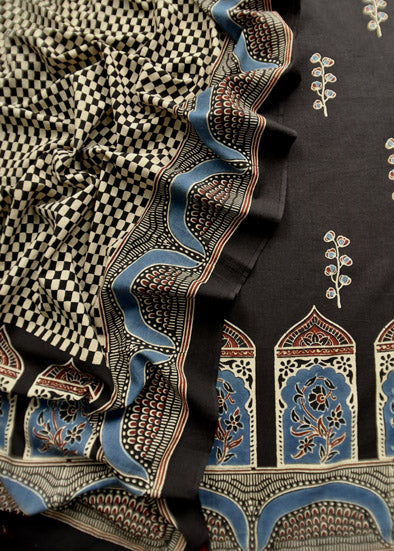 100% Pure Cotton three-piece suit adorned with Ajrakh hand block printing with natural dyes.