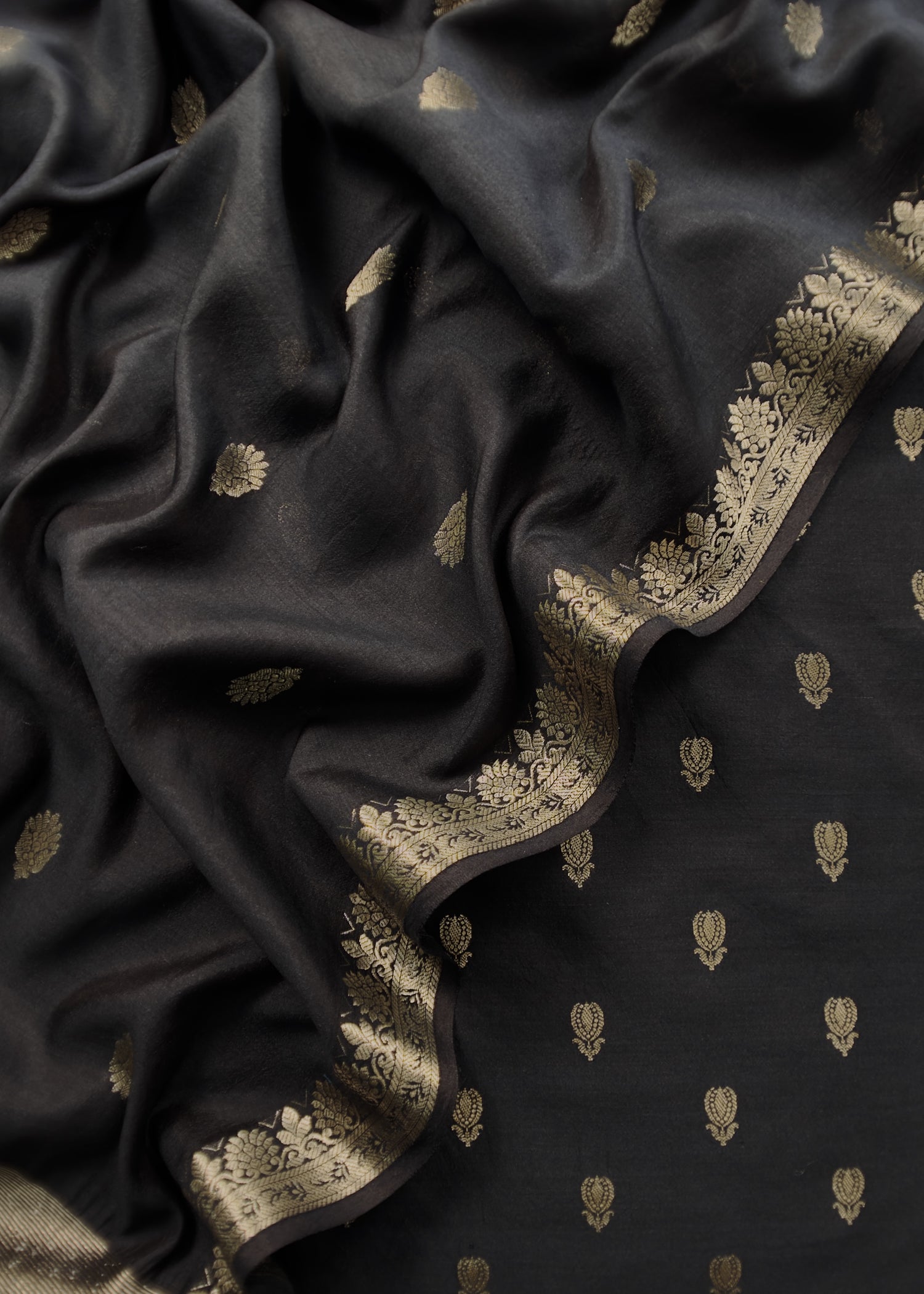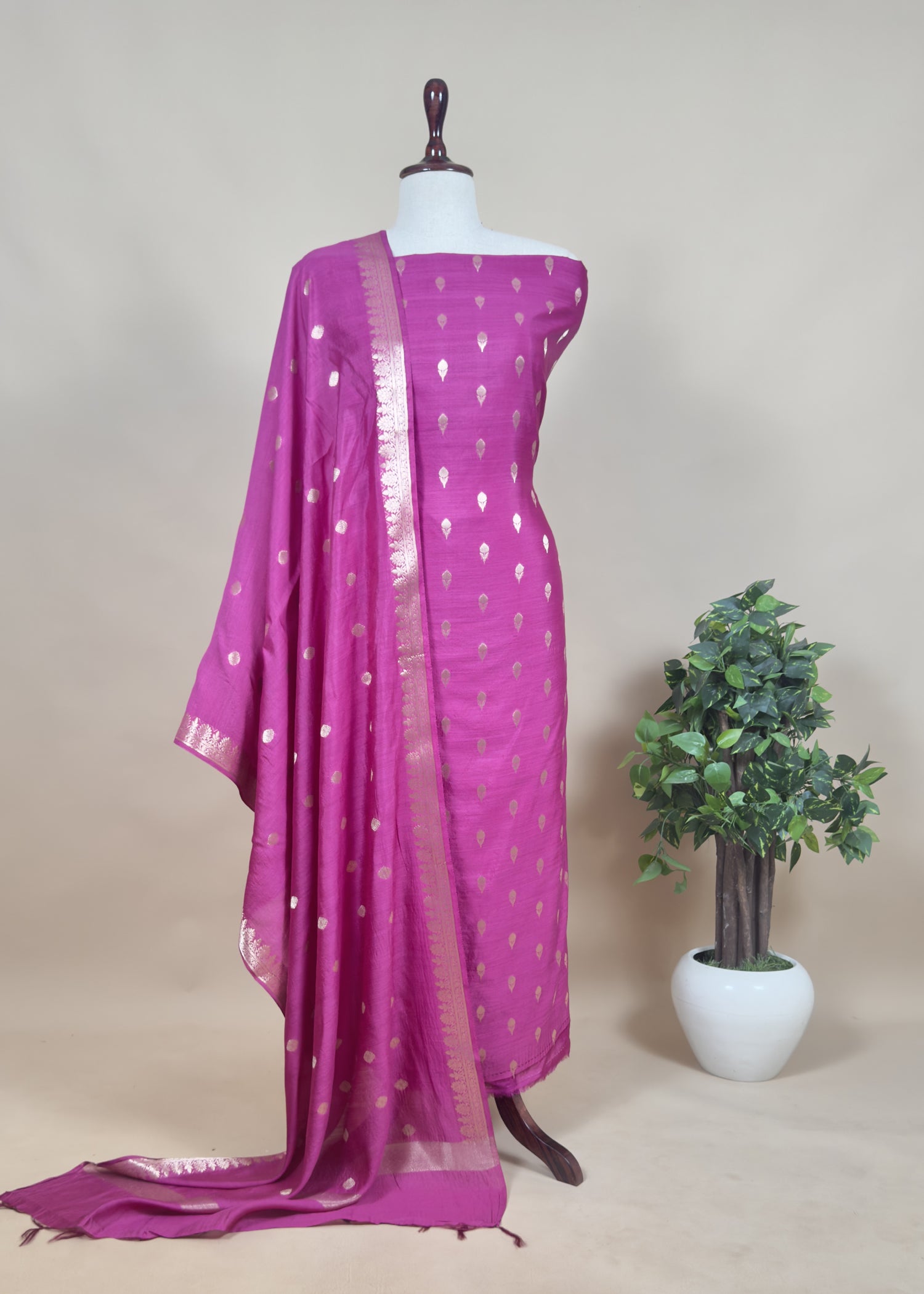 Get your hands on Kalasheel’s unstitched three-piece suit set, including a kurta, dupatta, and bottom in pure Munga silk, beautifully adorned with zari weaving.