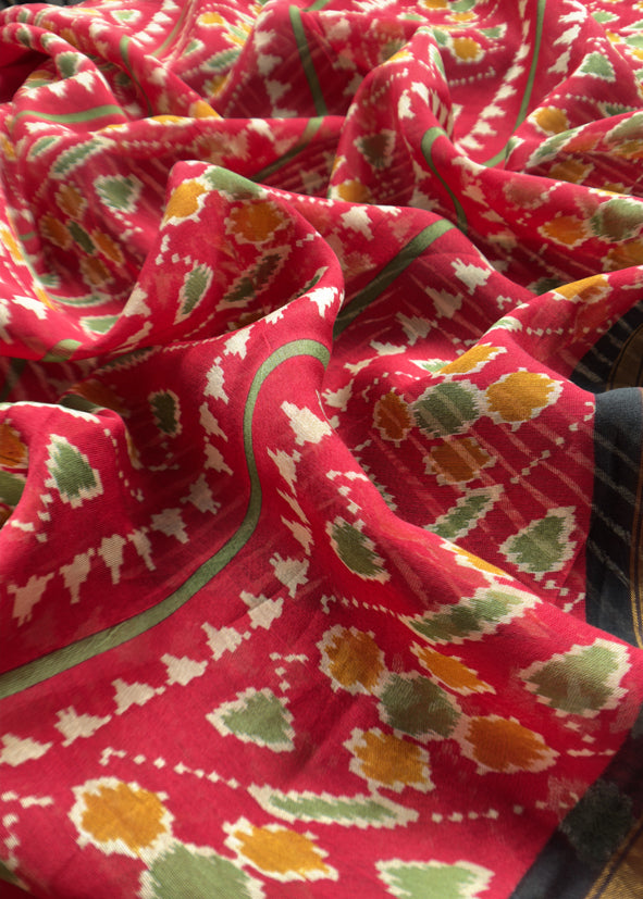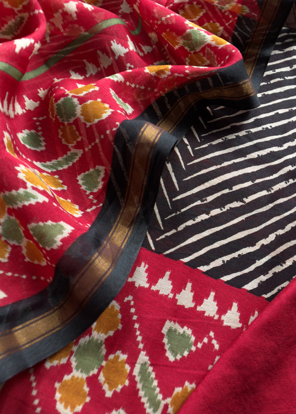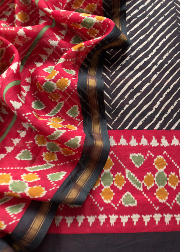 Black Leheriya Maheshwari Silk Unstitched Suit With Patola Dupatta