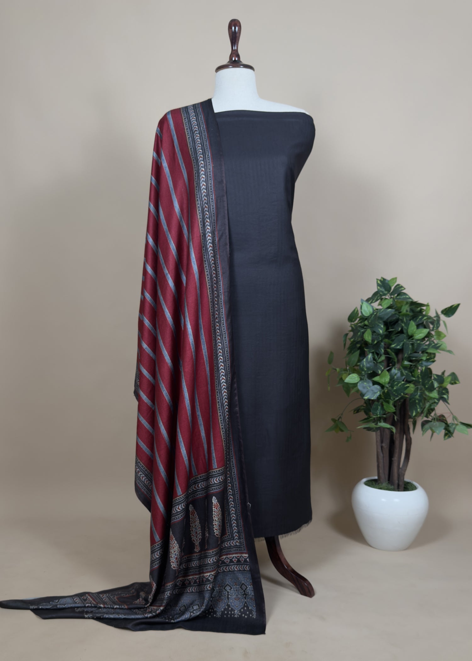 Monotone fine-quality pashmina unstitched three-piece suit set featuring plain pashmina kurta and pashmina lowers fabric paired with traditional dupatta having all-over paisley motifs for a visual delight.