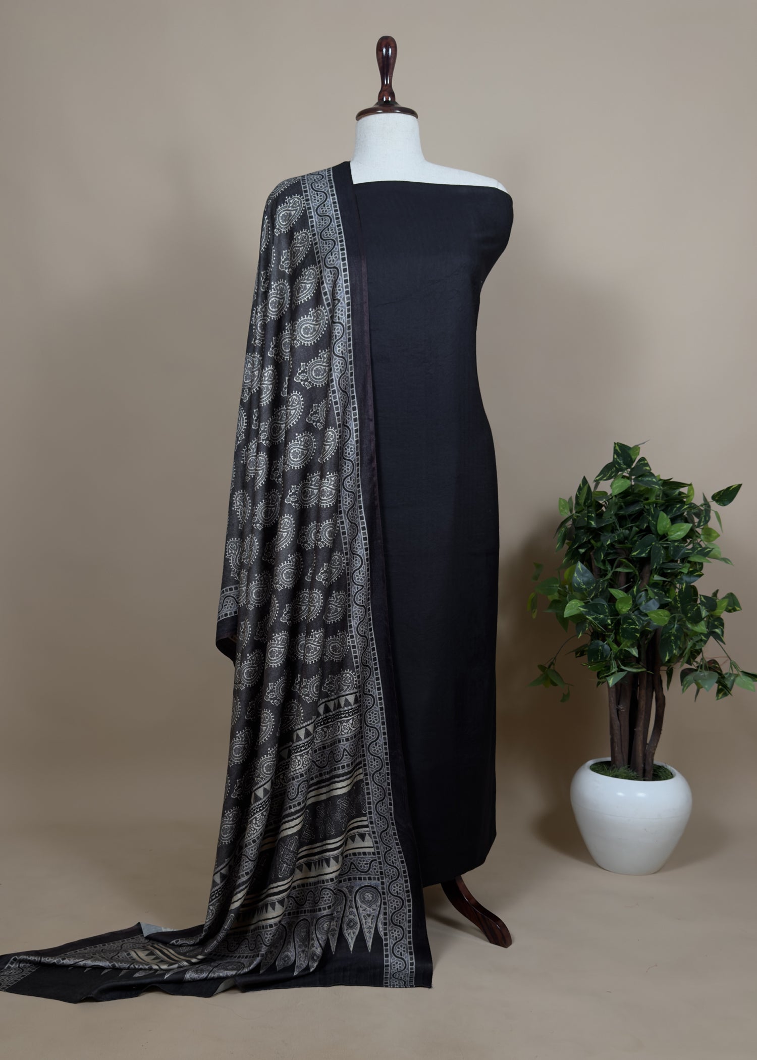 Monotone fine-quality pashmina unstitched three-piece suit set featuring plain pashmina kurta and pashmina lowers fabric paired with traditional dupatta having all-over paisley motifs for a visual delight.