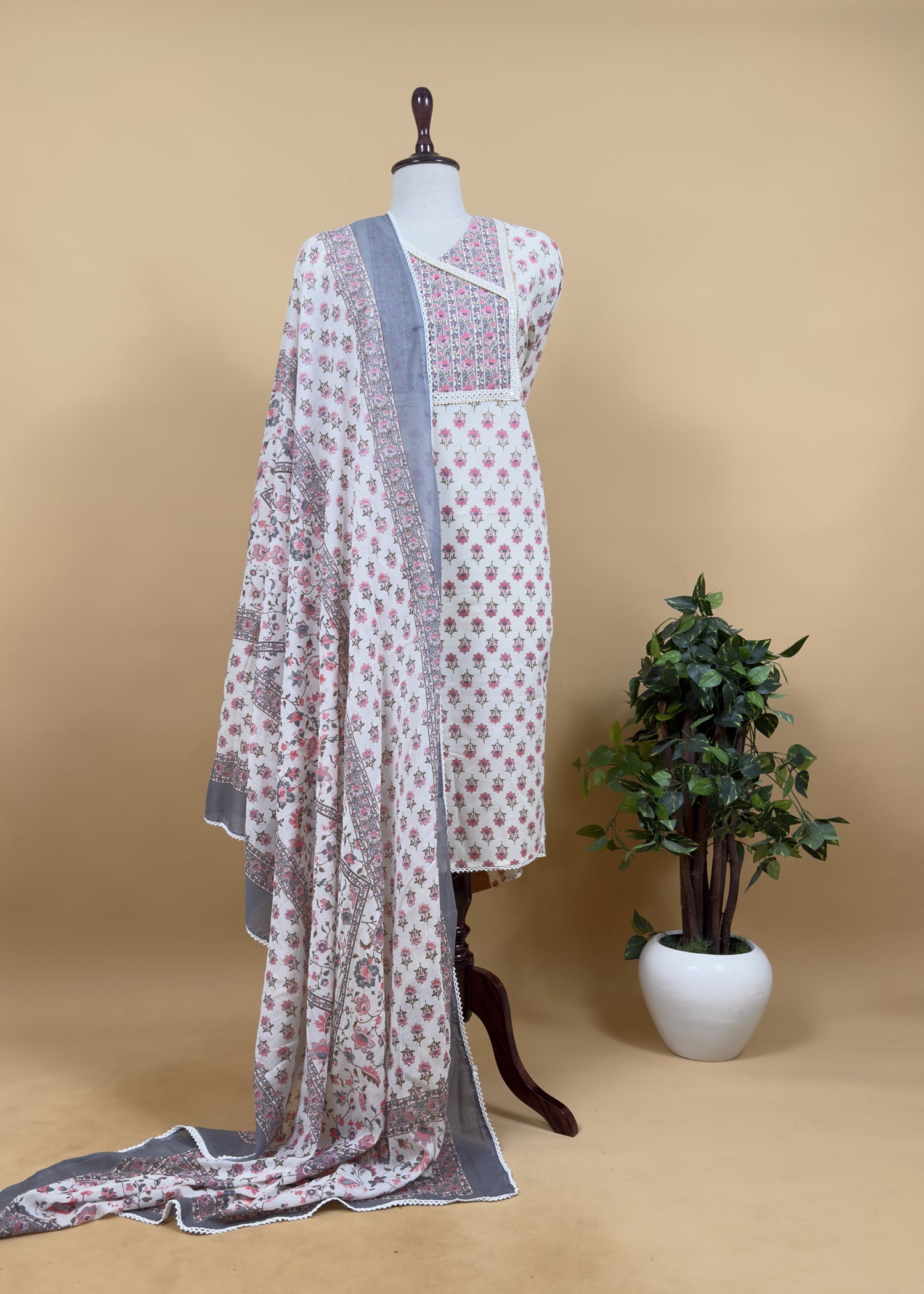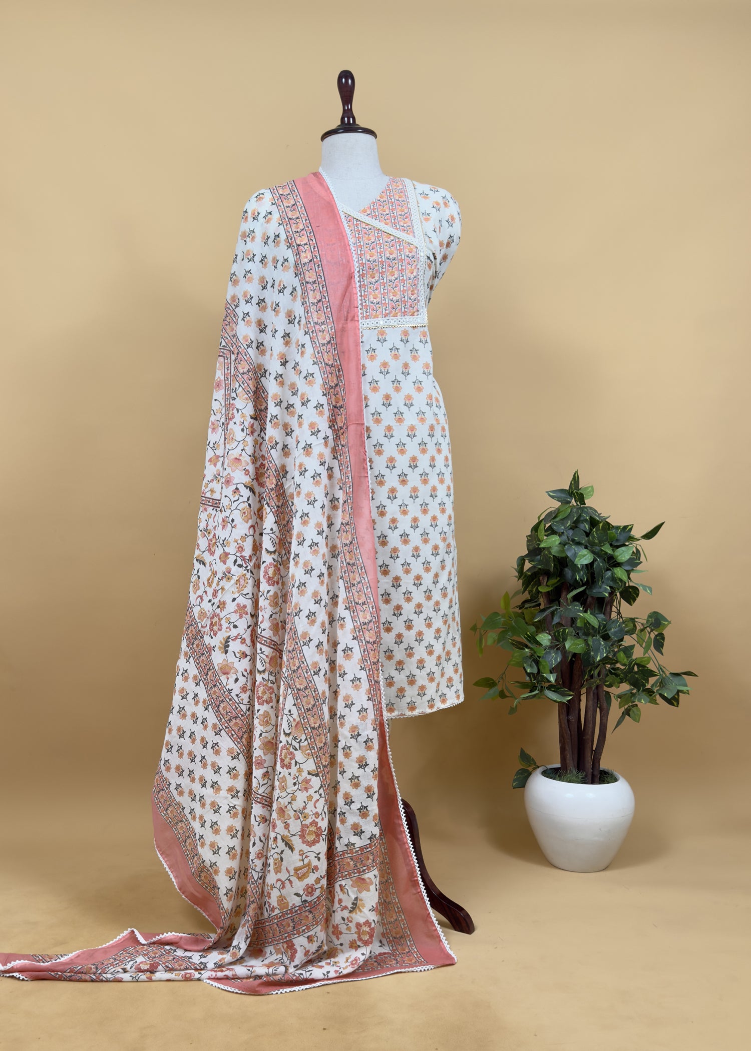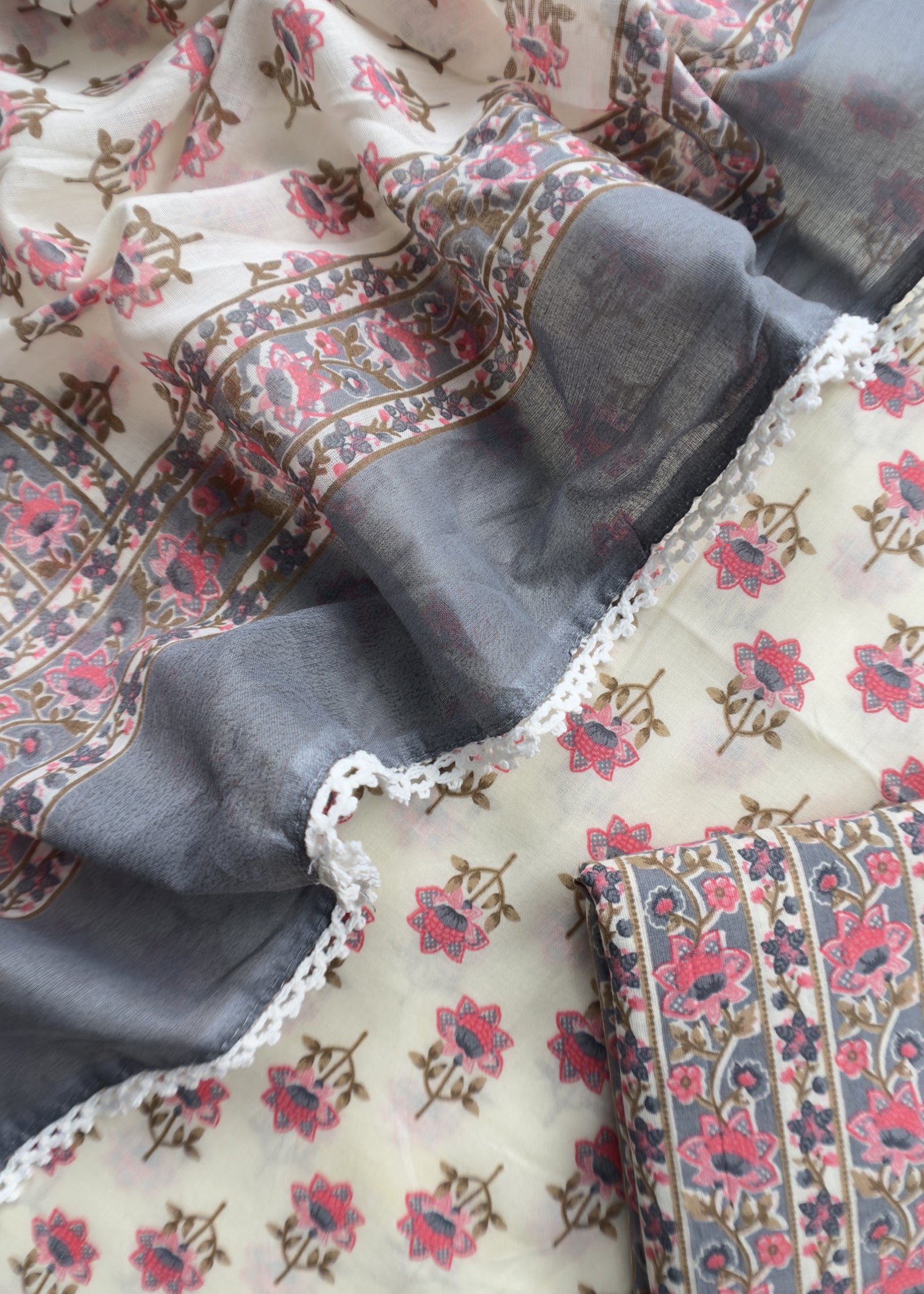 Get your hands on summer must haves three piece pure cotton hand block print suit with beautiful neckline and laces on borders.