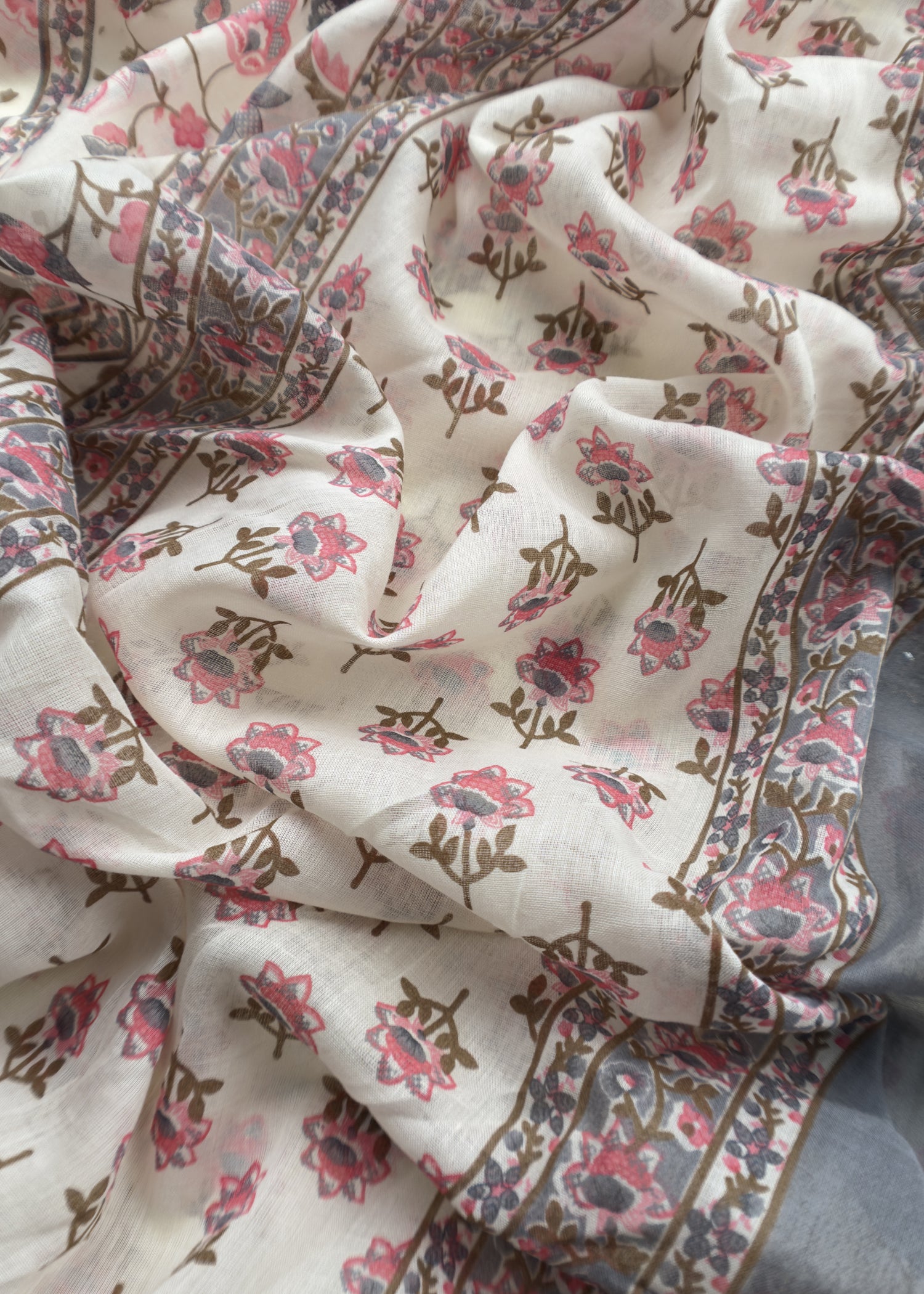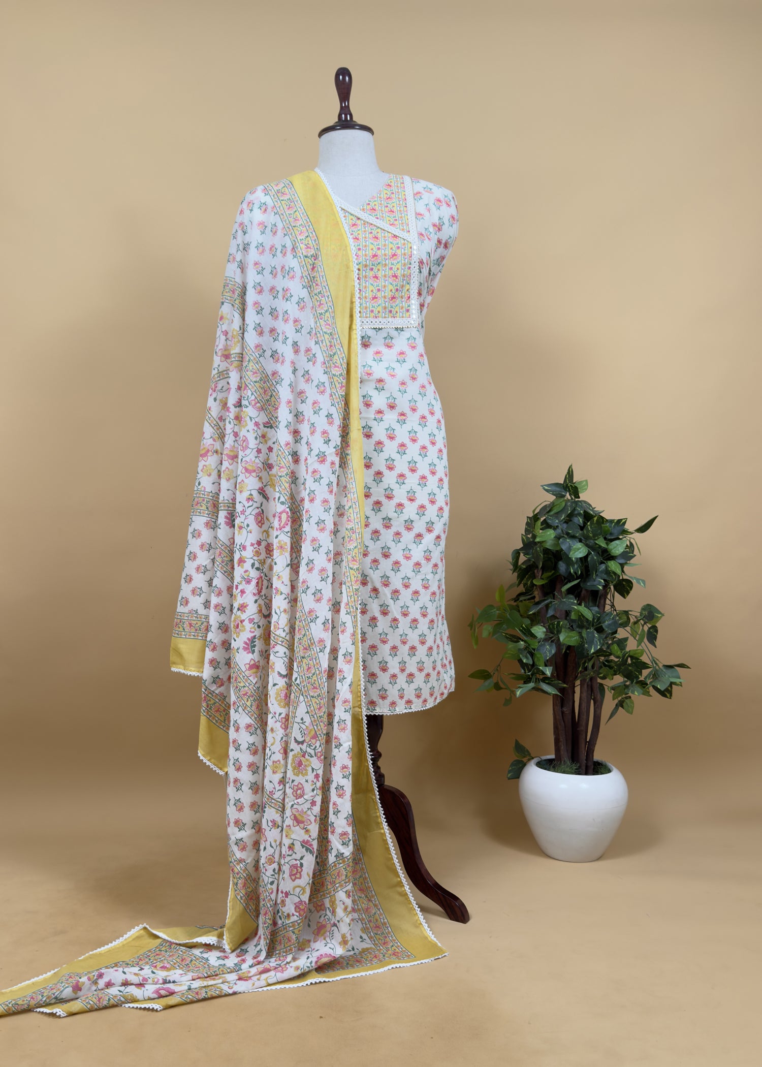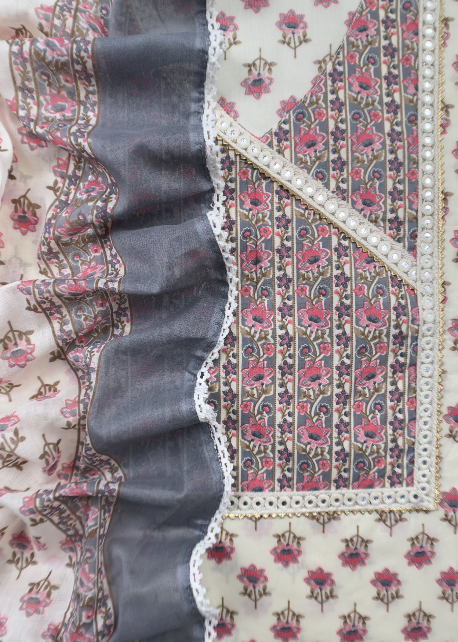 Get your hands on summer must haves three piece pure cotton hand block print suit with beautiful neckline and laces on borders.