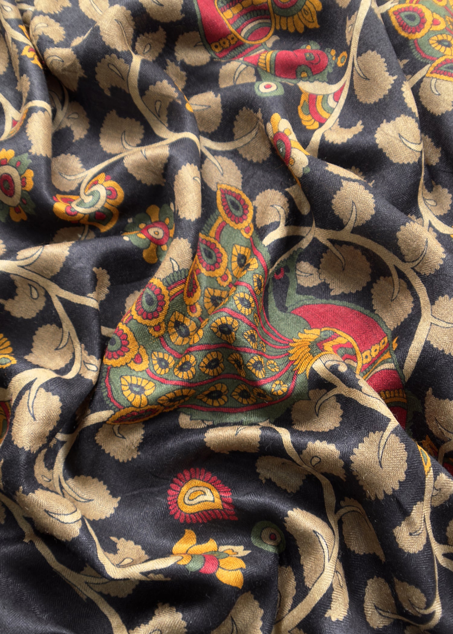 Pure pashmina vibrant plain kurta with pure pashmina kalamkari print dupatta and pashmina bottom.