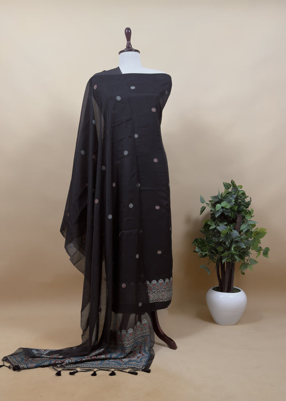 Black Traditional Linen Chanderi Suit Fabric With Jamdani Weaving