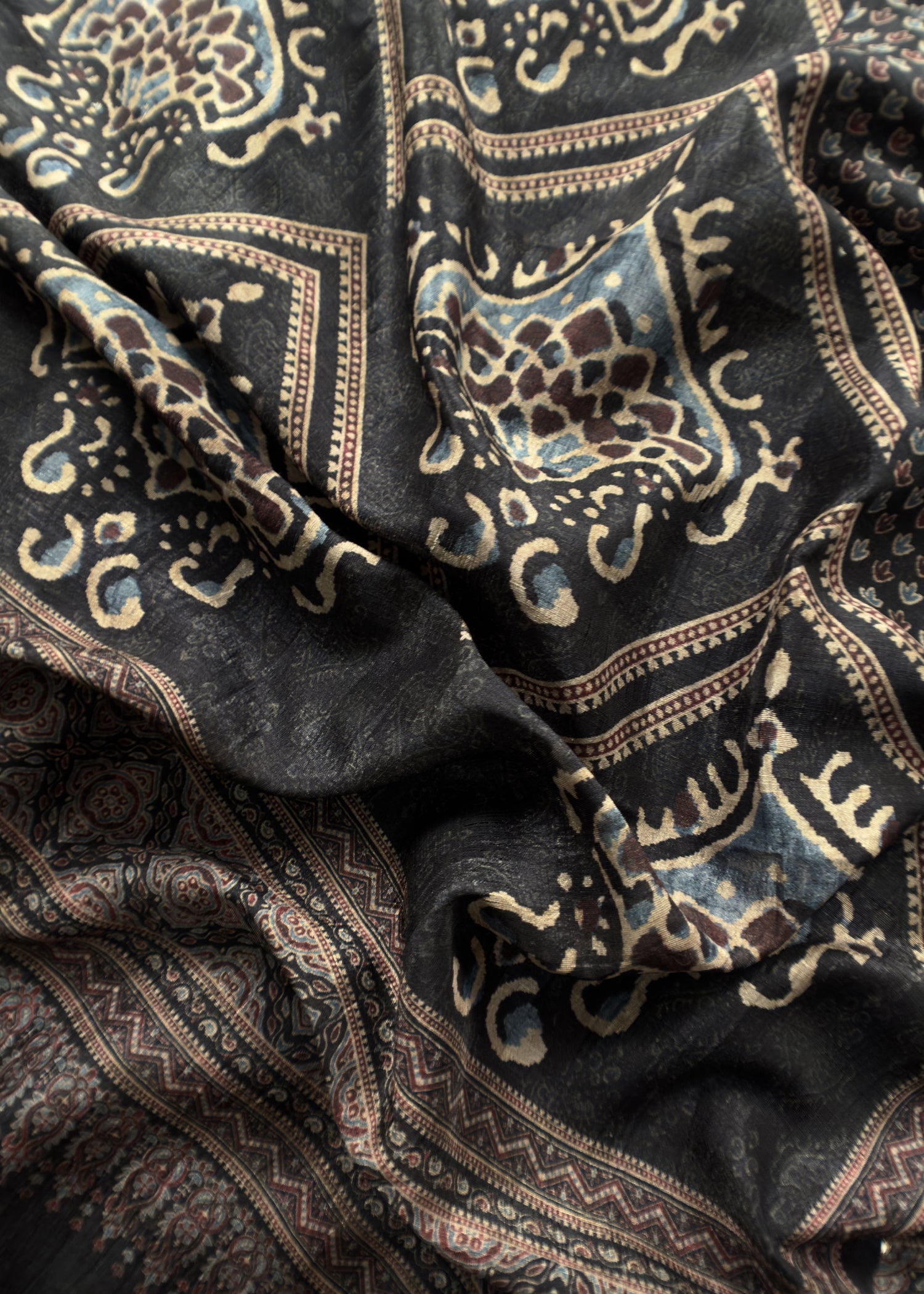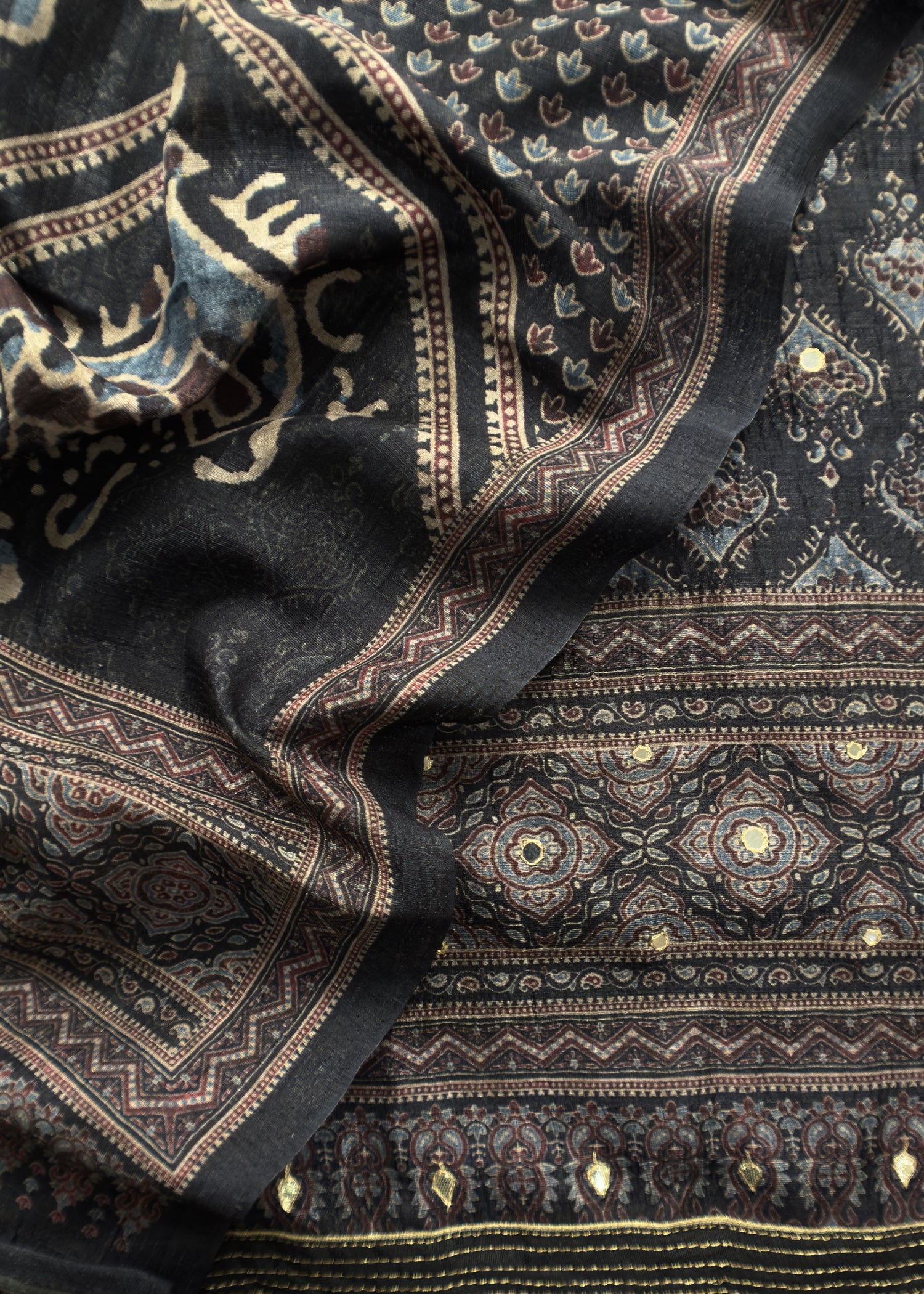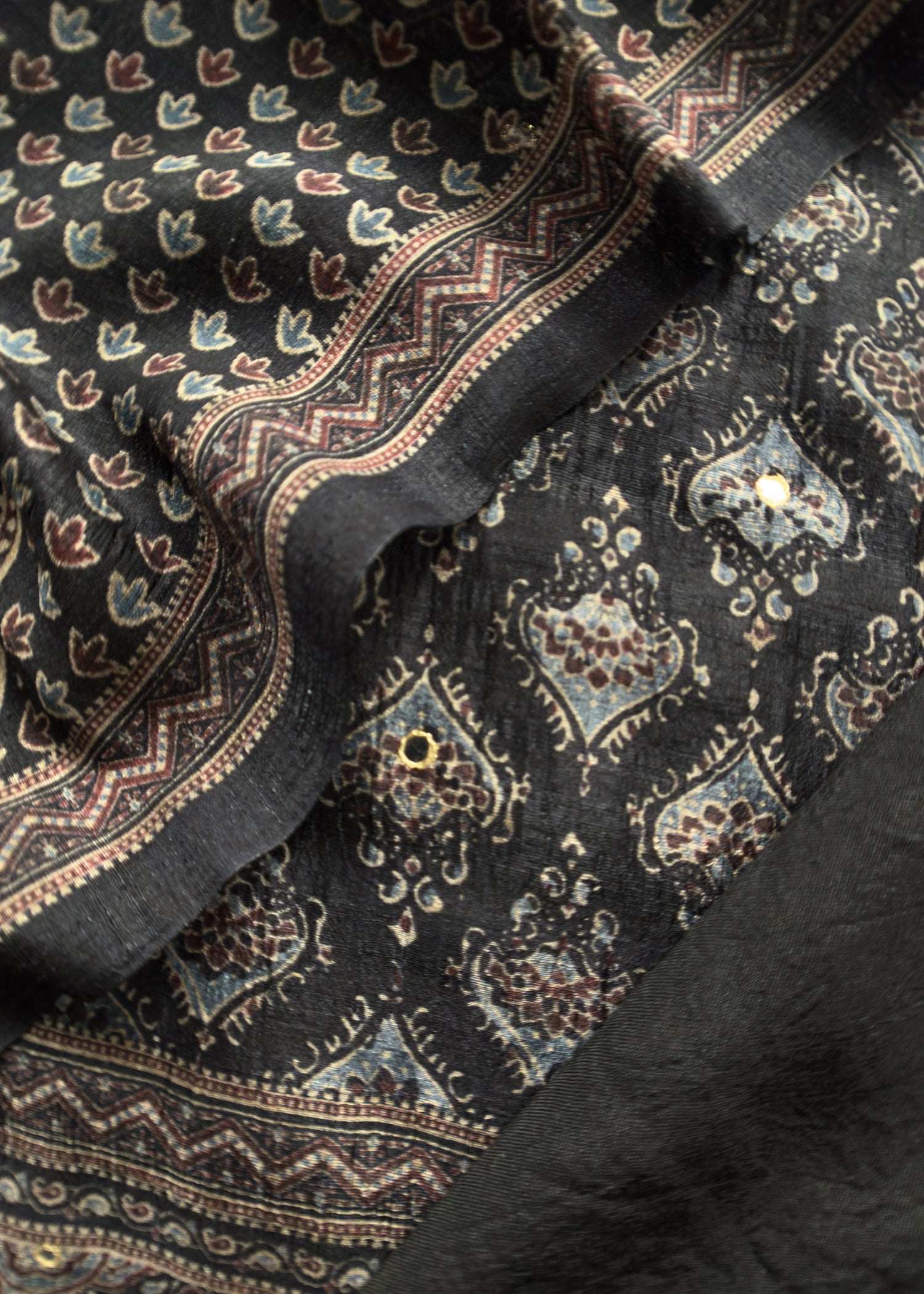 Versatile and comfortable, this digitally printed Ajrakh suit in Tussar features intricate handwork Gota Patti detailing along the neckline, paired with a plain bottom.