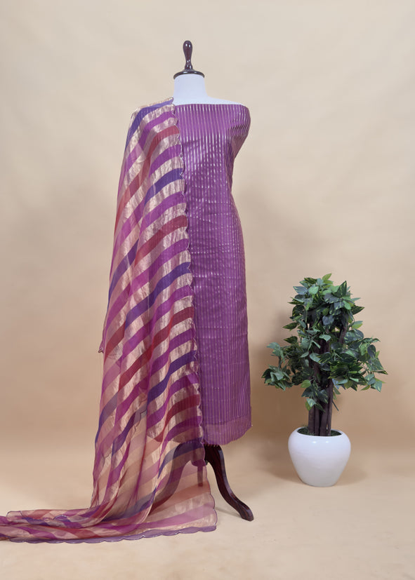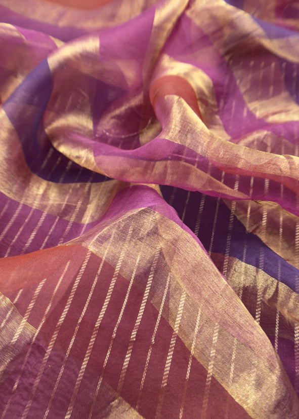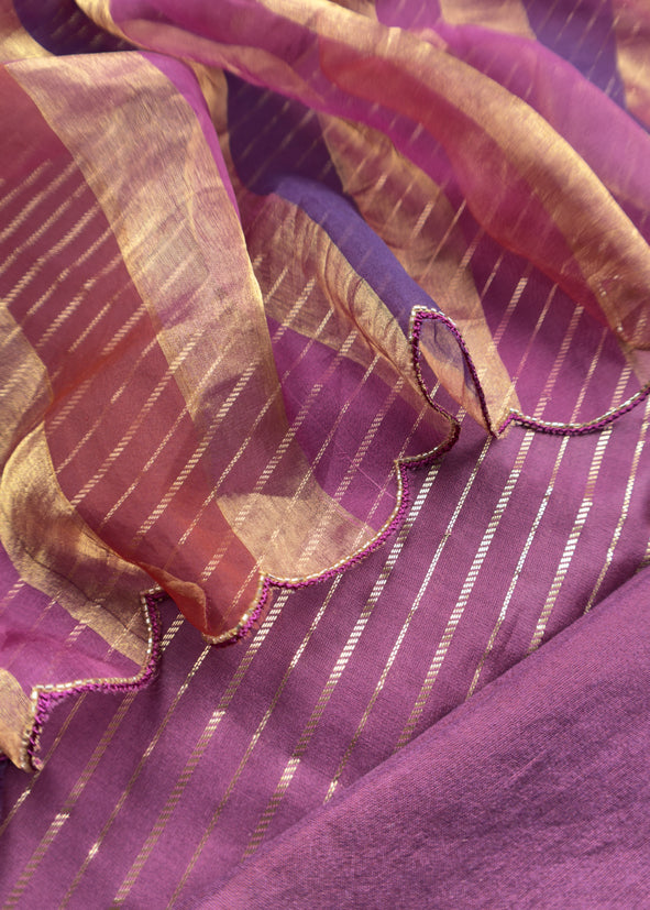 Handloom silk kurta with vertical gold weaves paired with tissue silk triple orange, purple, wine gold zari panel having cutdana scalloping and matching cotton silk lowers.