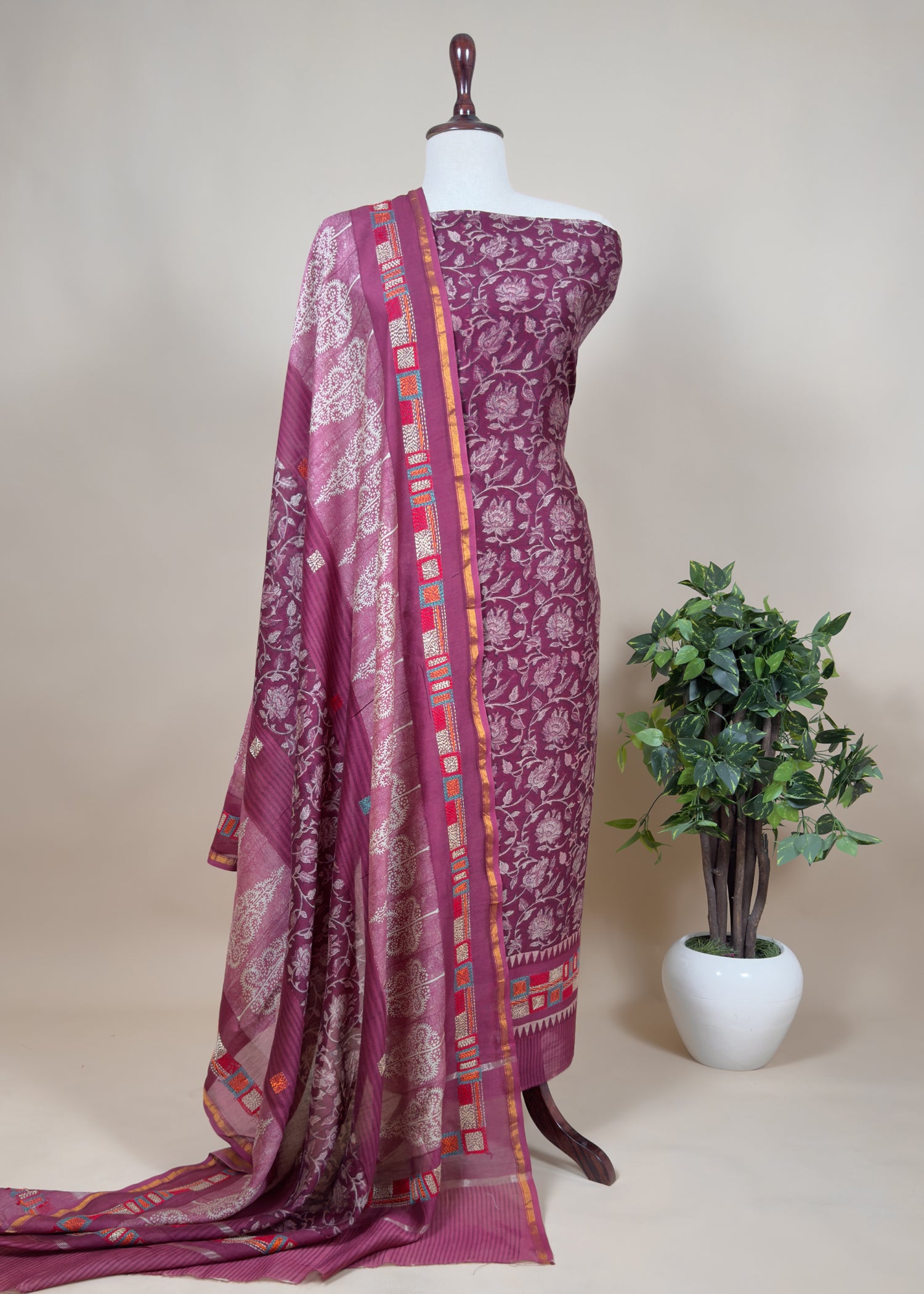 Block Print Handloom Maheshwari Silk Unstitched Dupatta-Suit With Kantha Embroidery