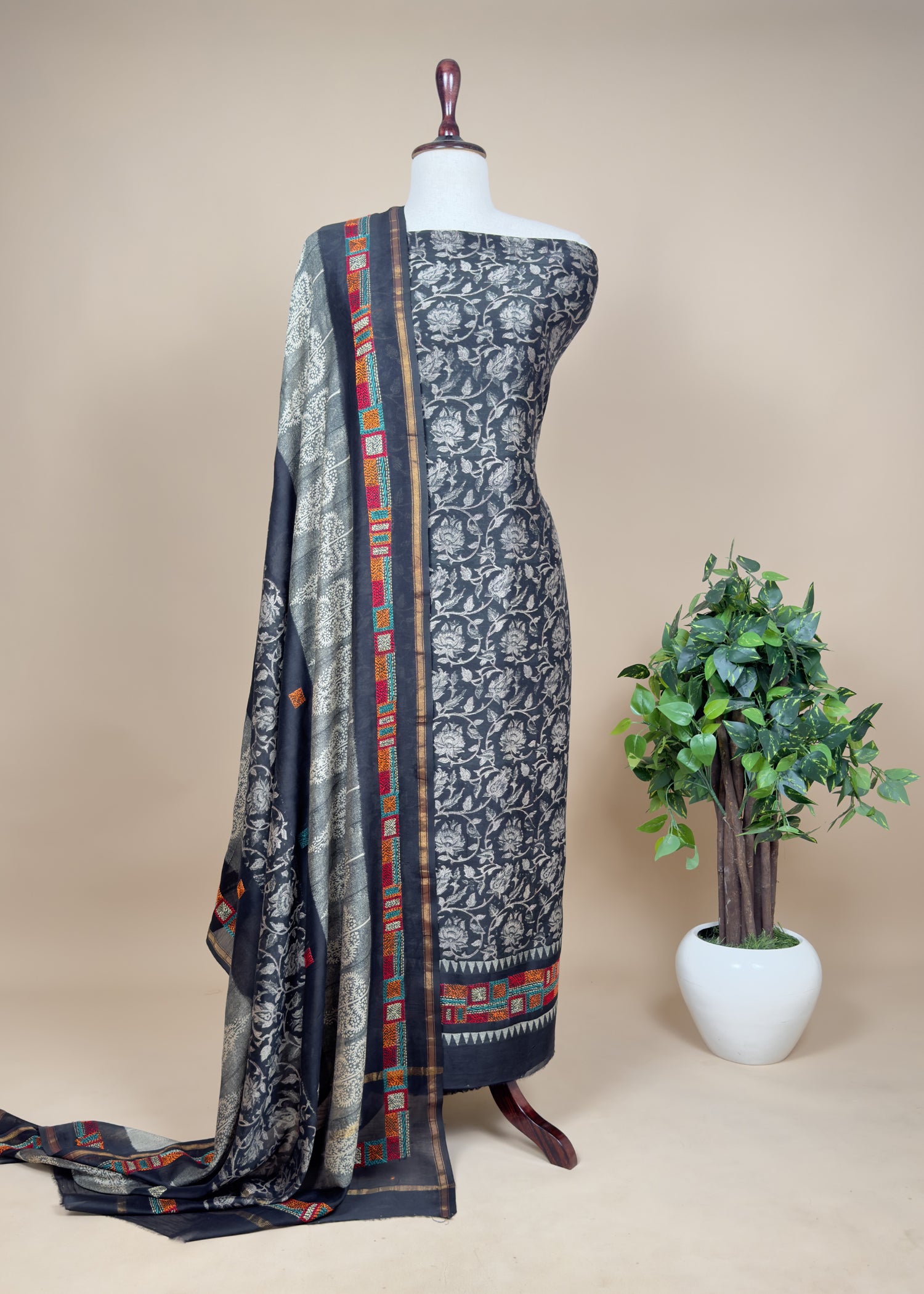Block Print Handloom Maheshwari Silk Unstitched Dupatta-Suit With Kantha Embroidery