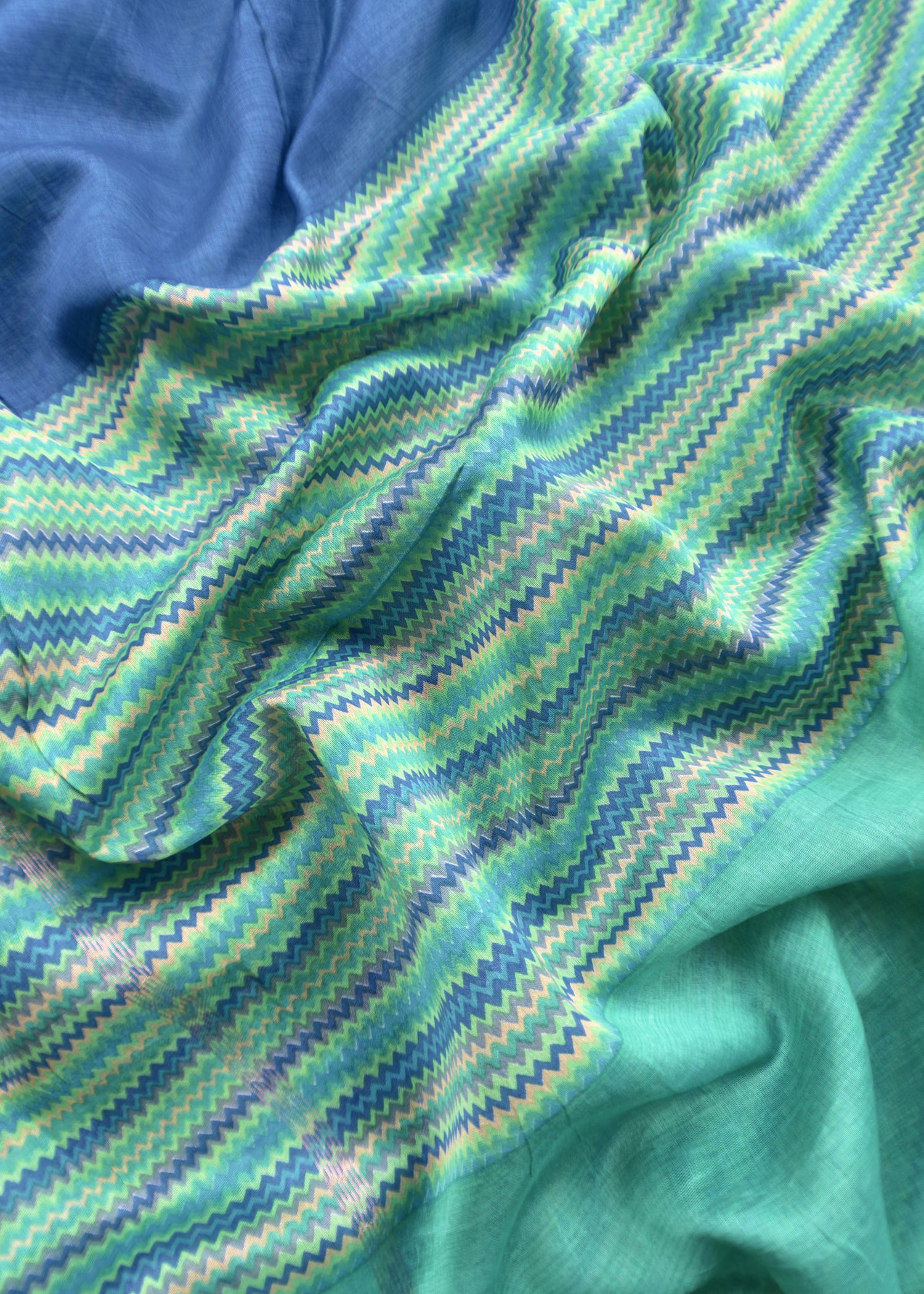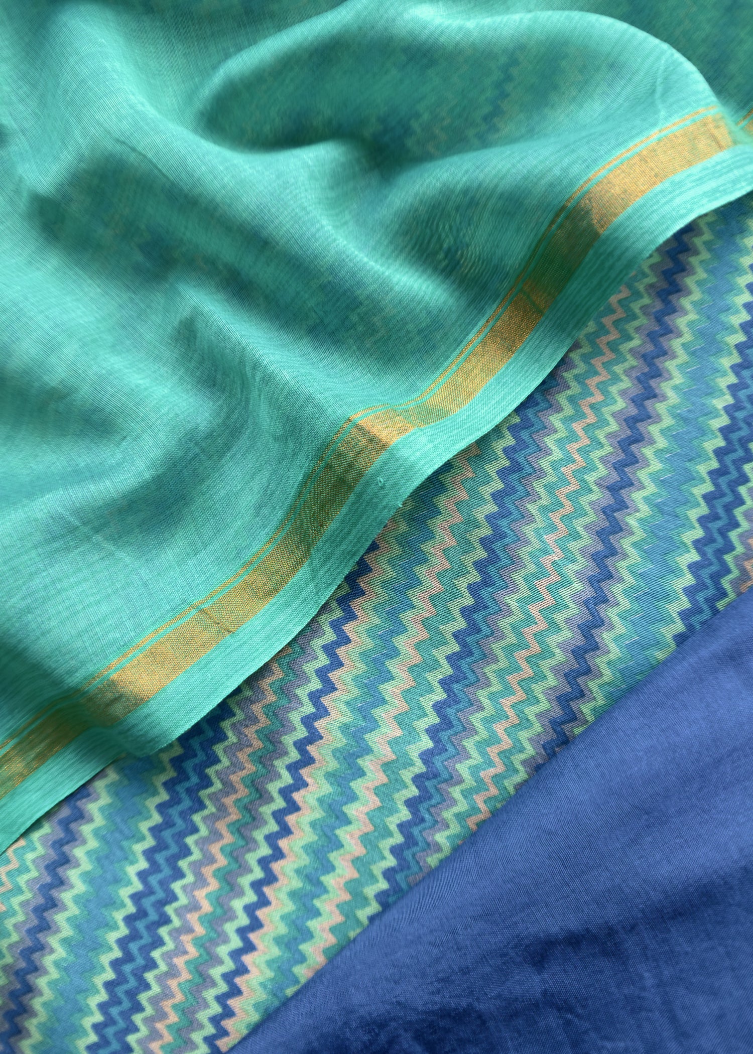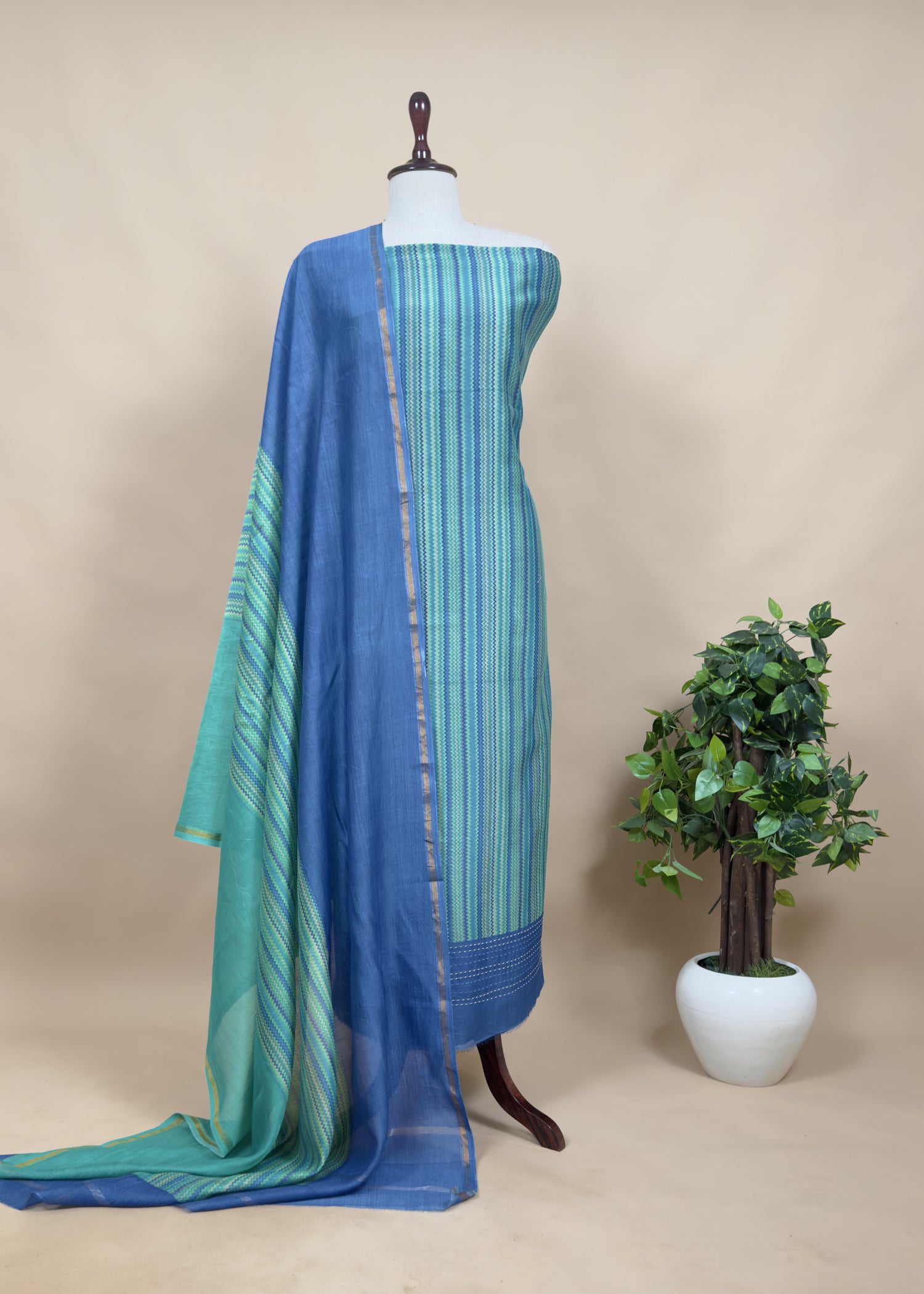 Blue And Green Pure Maheshwari Silk Suit With Kantha Handwork