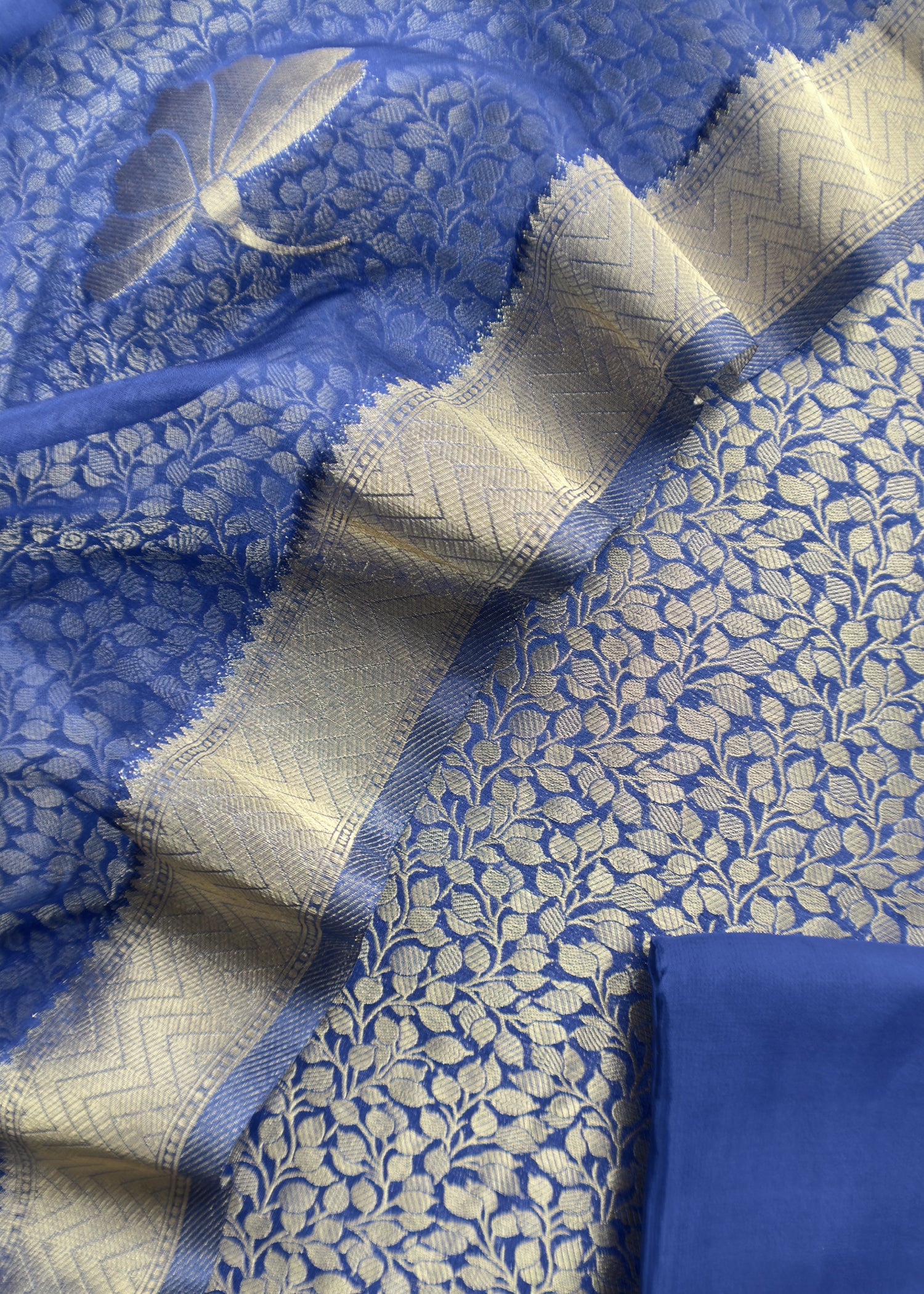 Blue Banarasi Silk Brocade Suit With Organza Dupatta