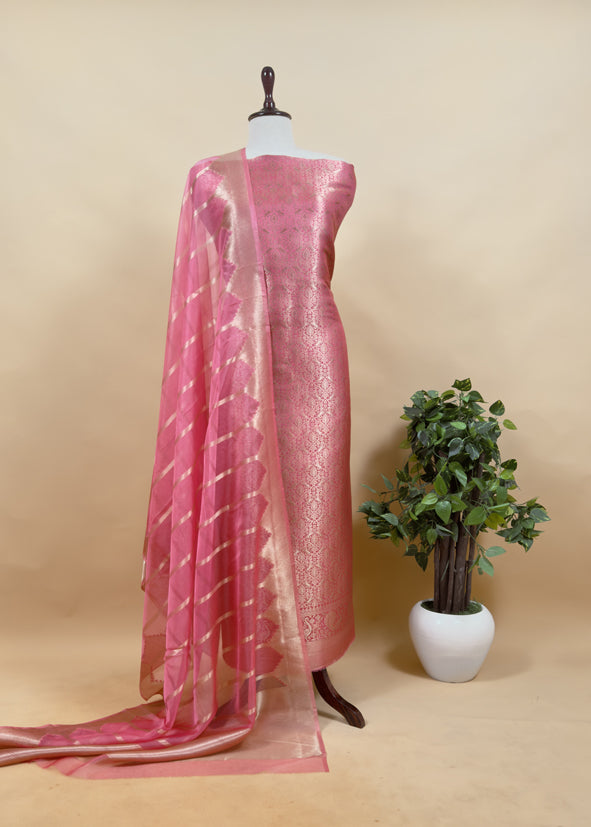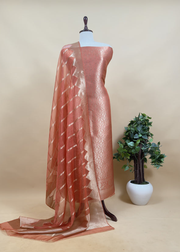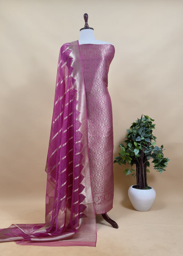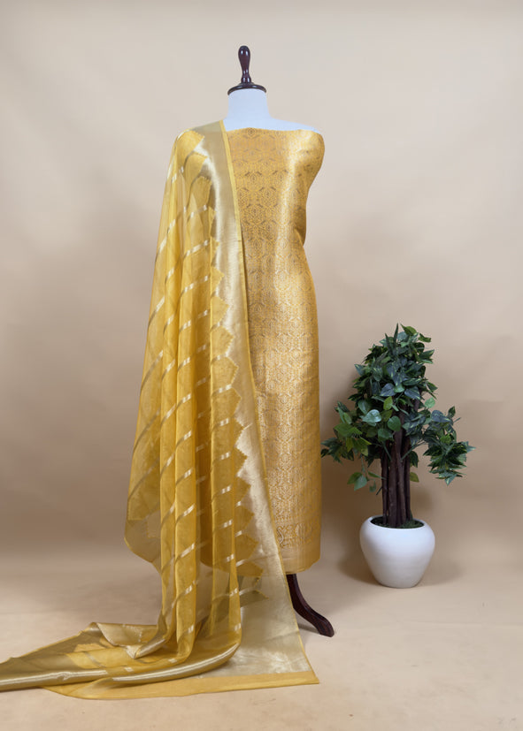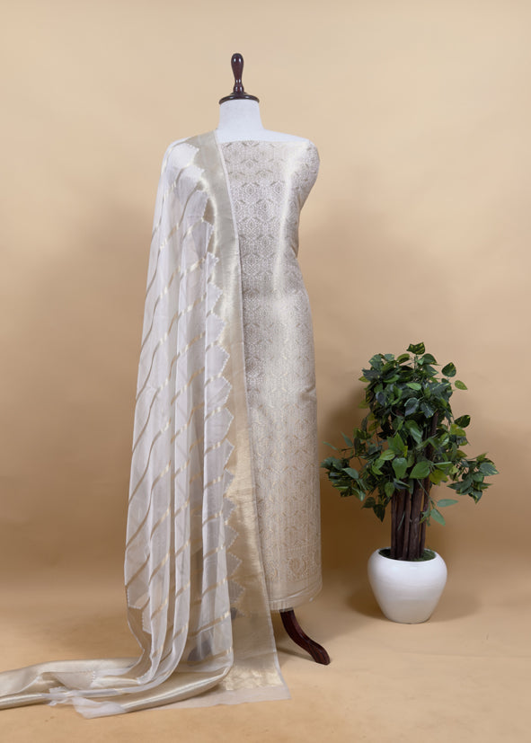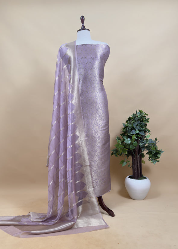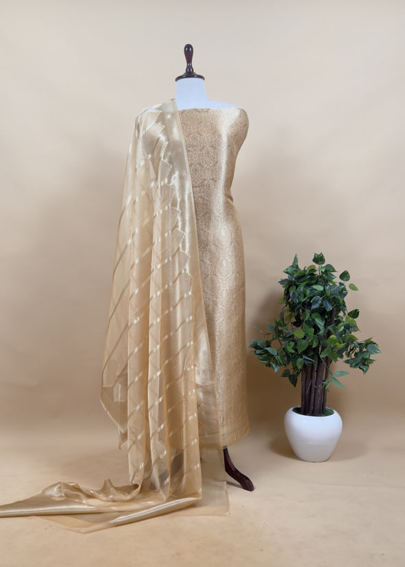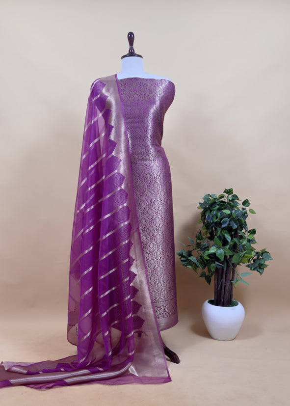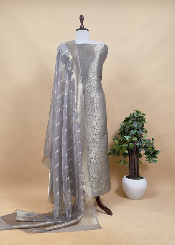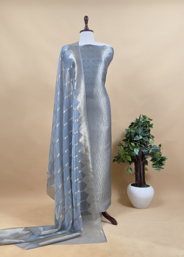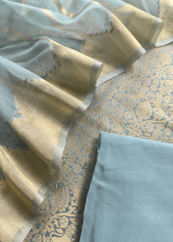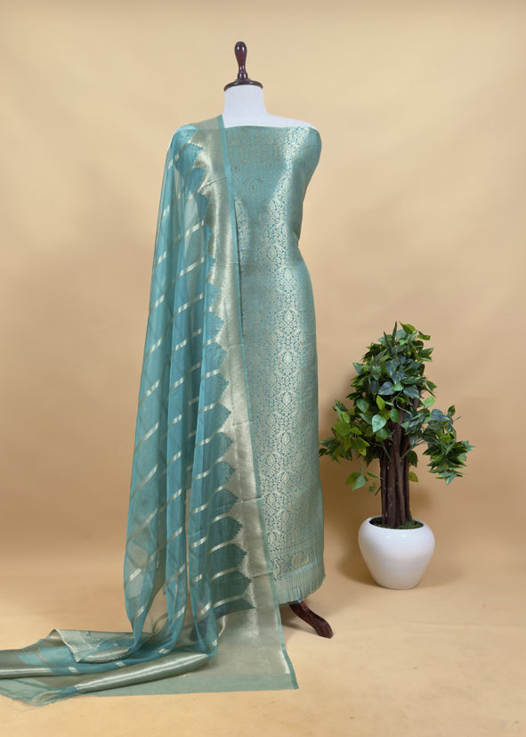 Blue Banarasi Silk Brocade Suit With Organza Dupatta