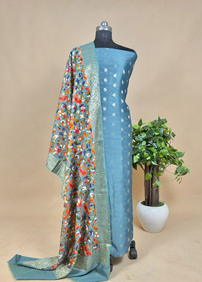 Banarasi Unstitched Suit In Chanderi adorned with exquisite Zari Bootis, paired flawlessly with a mesmerizing Kalamkari Dupatta and Plain bottom.
