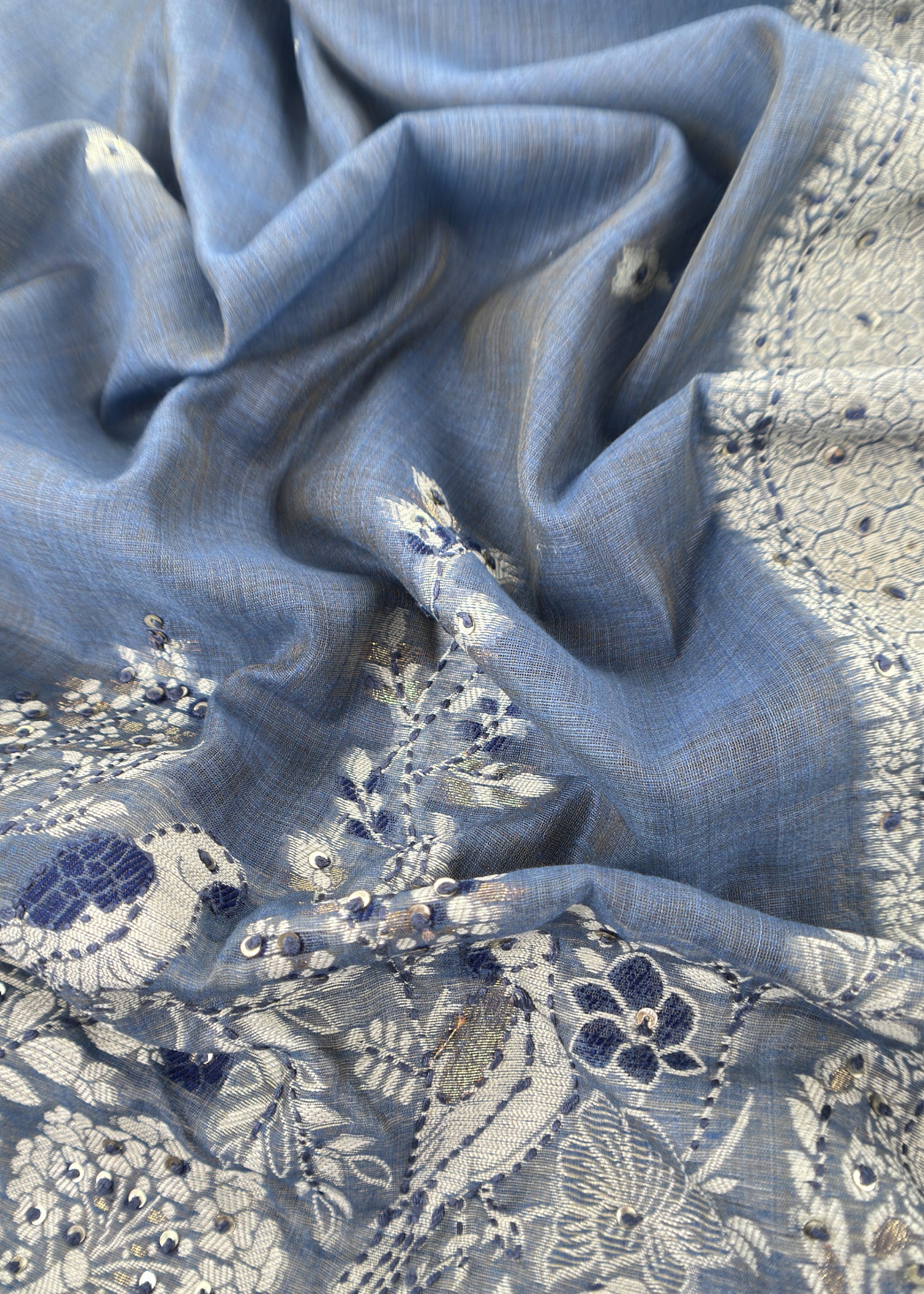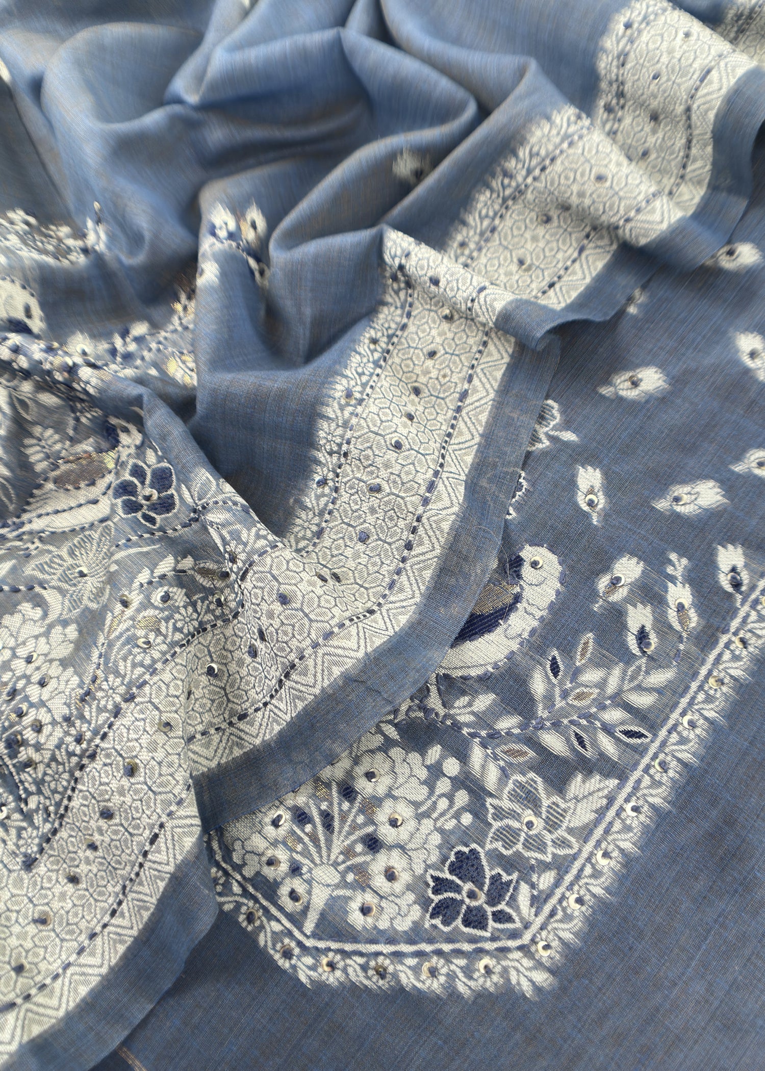 Blue Chanderi Linen Suit With Jamdani Weaving