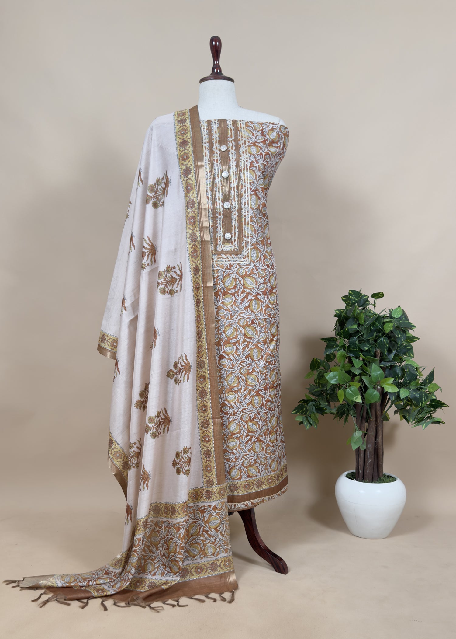 This hand-blocked print three-piece suit set in chanderi, adorned with gota dori work along the neckline, is paired with a contrasting chanderi dupatta and comes with a Santon bottom.