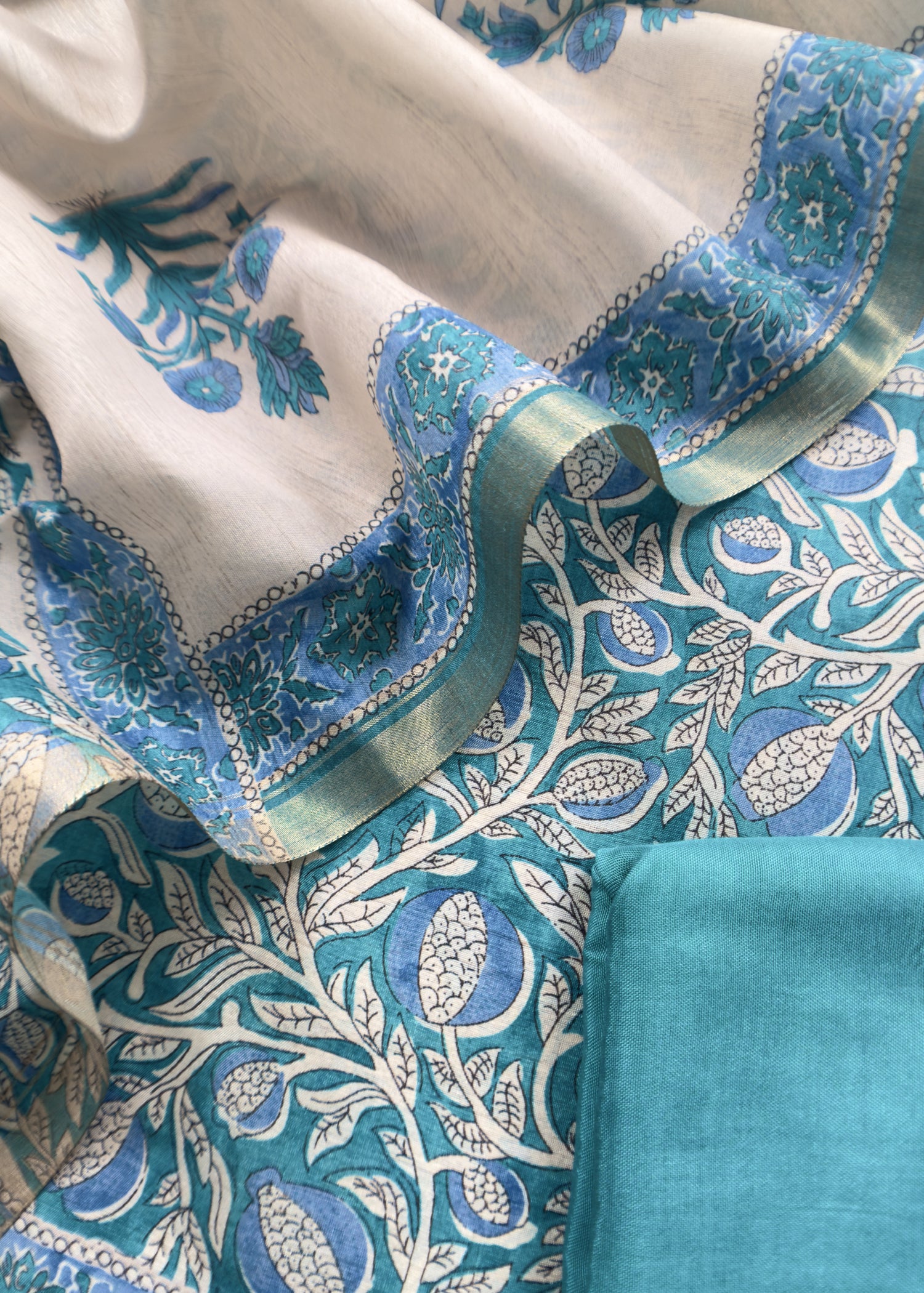 Blue Hand Block Print Unstitched Suit In Chanderi