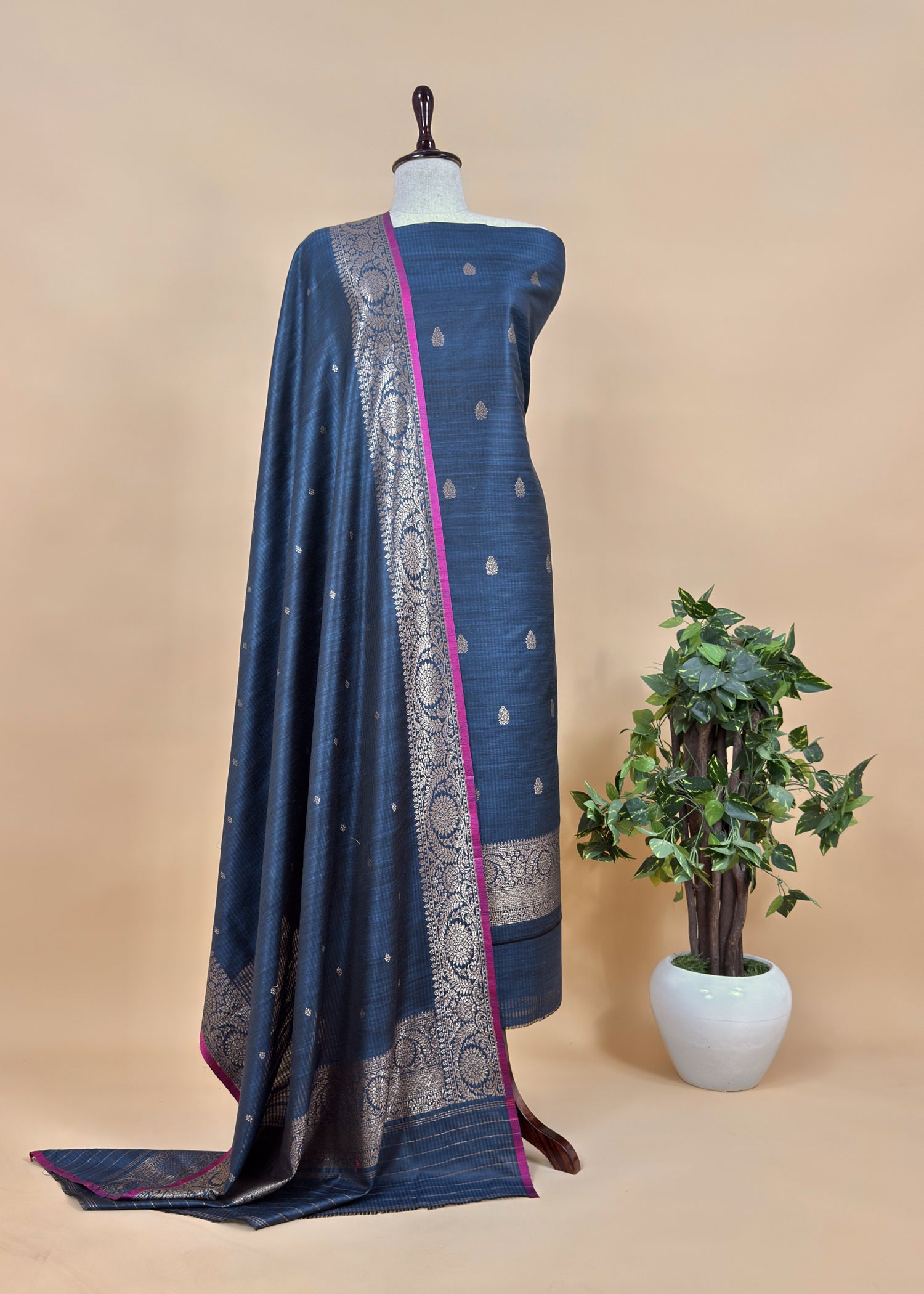 Blue Handloom Dupion Silk Suit With Kadwa Weaving