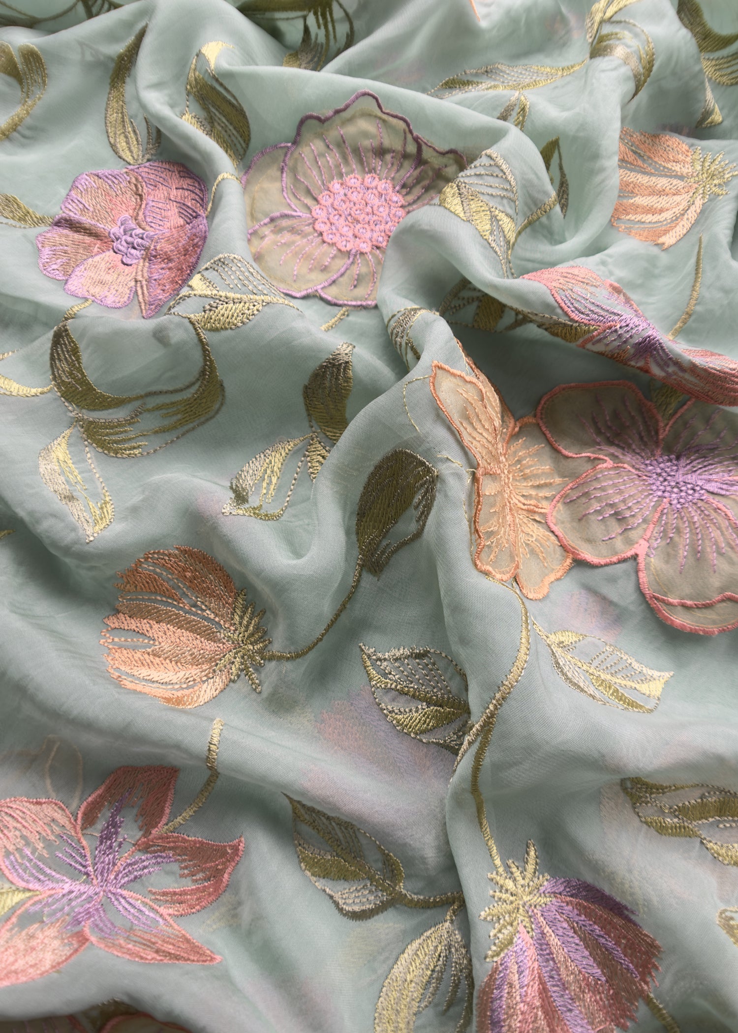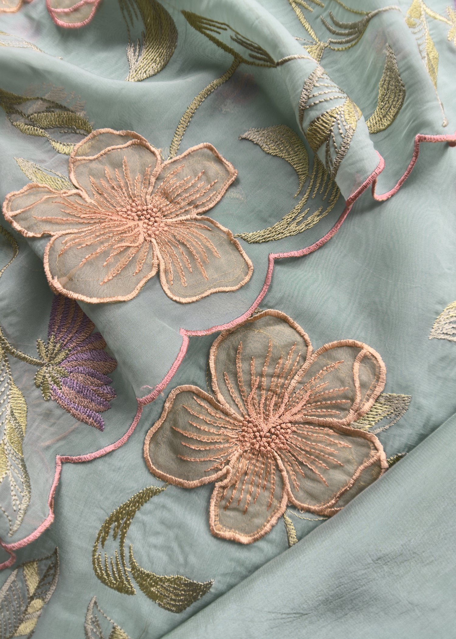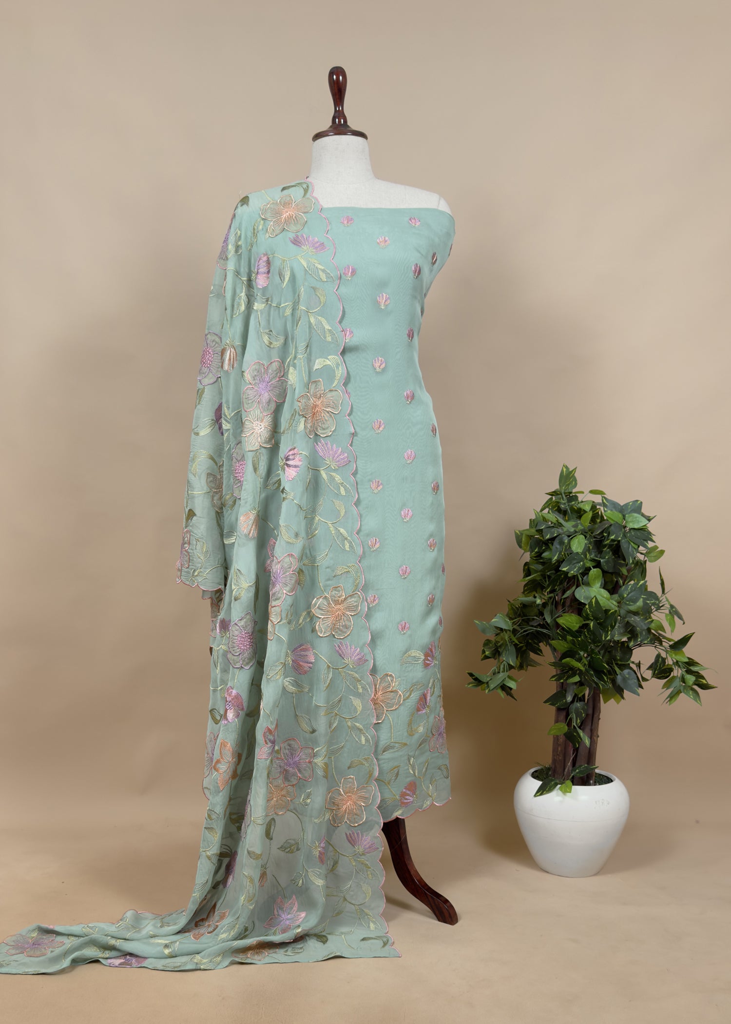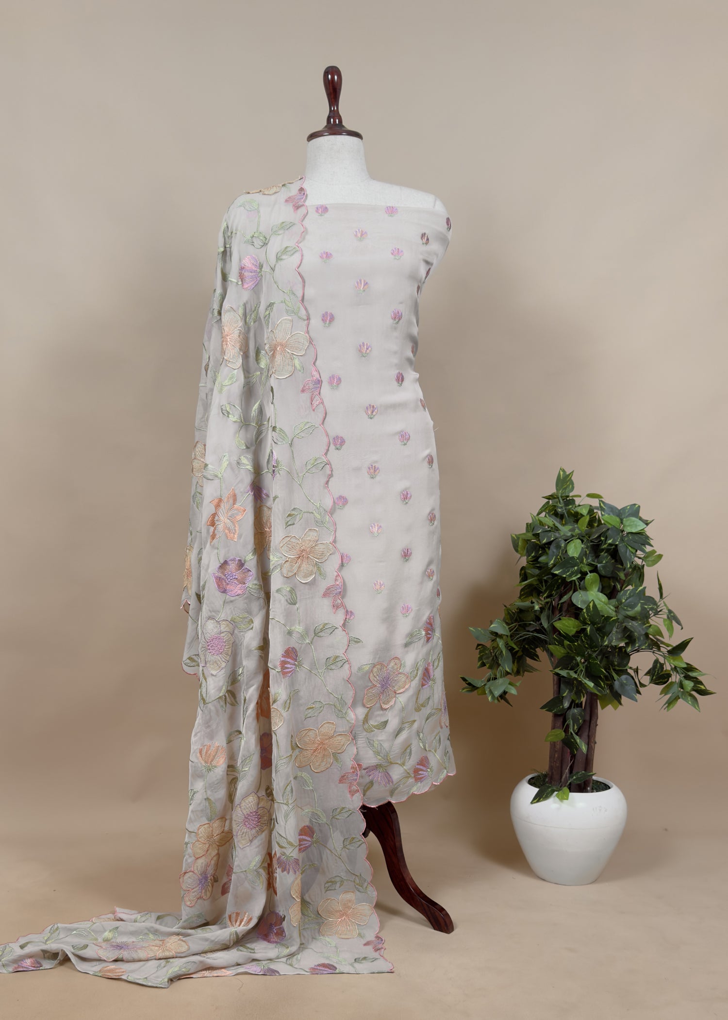 Pinteresty floral handloom organza suit set adorned with Resham floral bootis and 3rd phool Patti appliqué work all over the kurta and dupatta with embroidered scalloped ghera and dupatta and matching crepe silk bottom.
