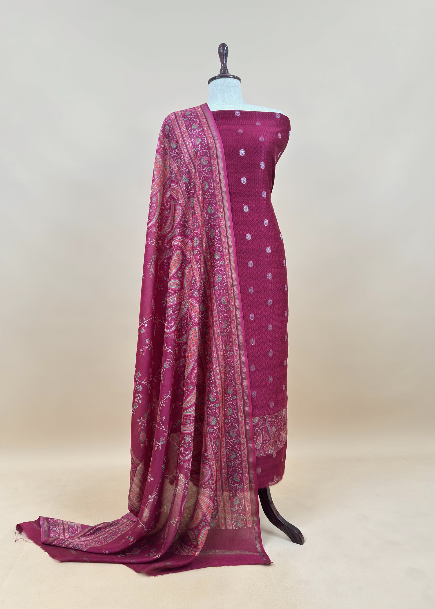 Presenting our bestseller unstitched three-piece suit set in handcrafted pure Maheshwari Silk fabric. The maheshwari silk kurta features traditional print with subtle gold banarasi bootis all over it paired with contrast Maheshwari Silk dupatta with traditional motifs and zari borders. The suit comes with fine quality matching bottom