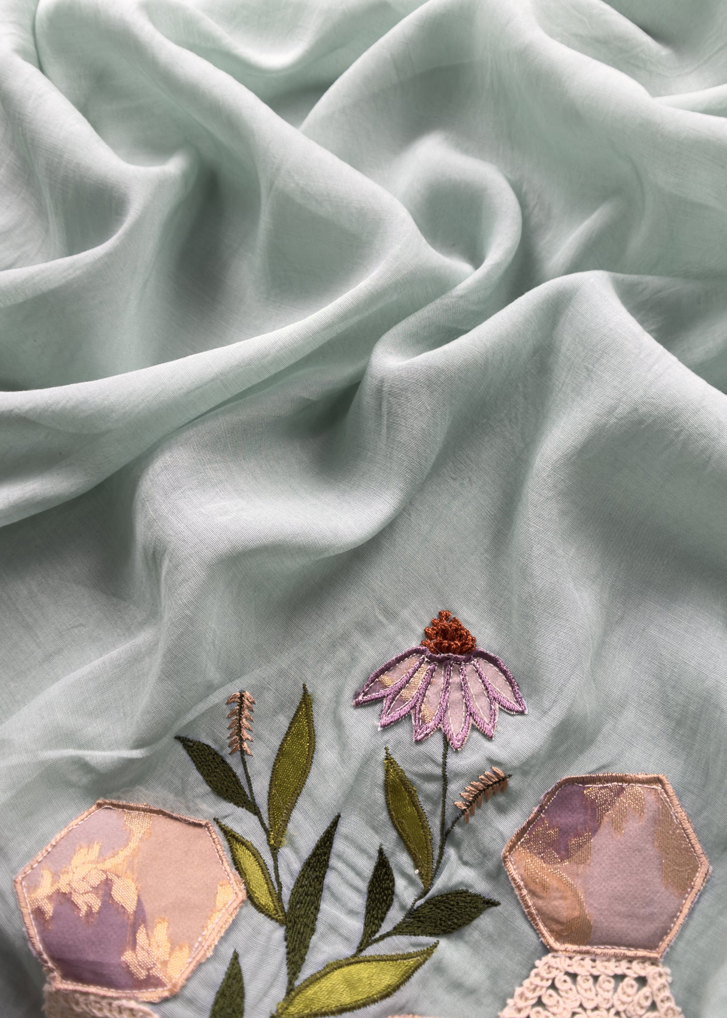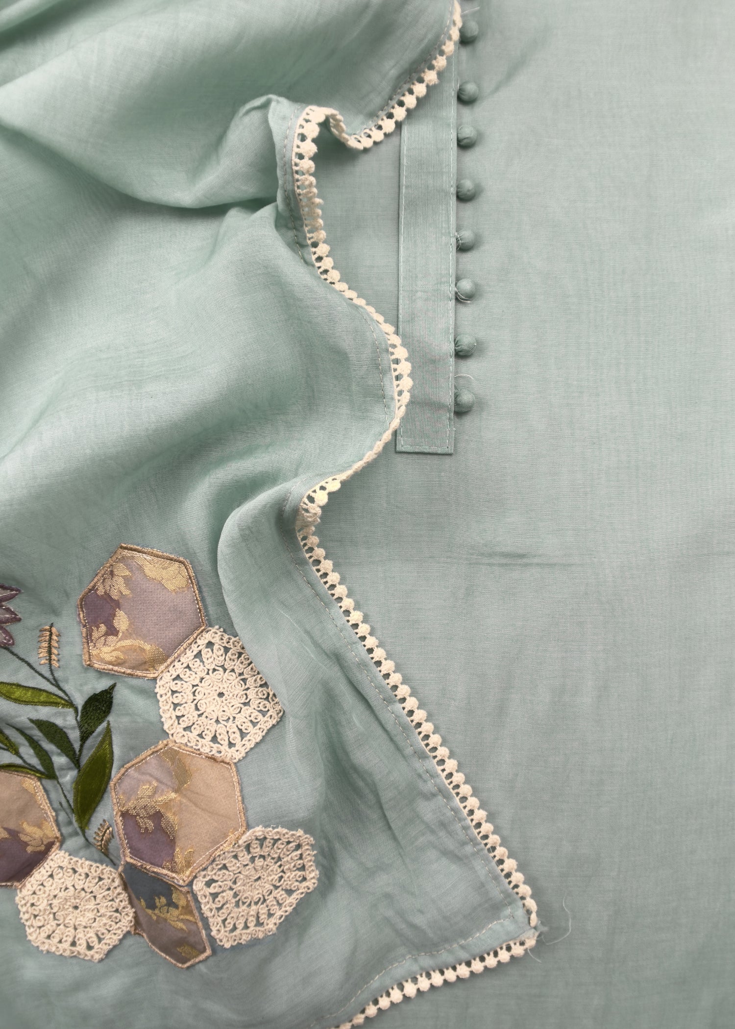 This summer suit in mulmul is adorned with appliqué and keroshia patchwork, paired with a matching embroidered mulmul dupatta and a soft cotton muslin lower.