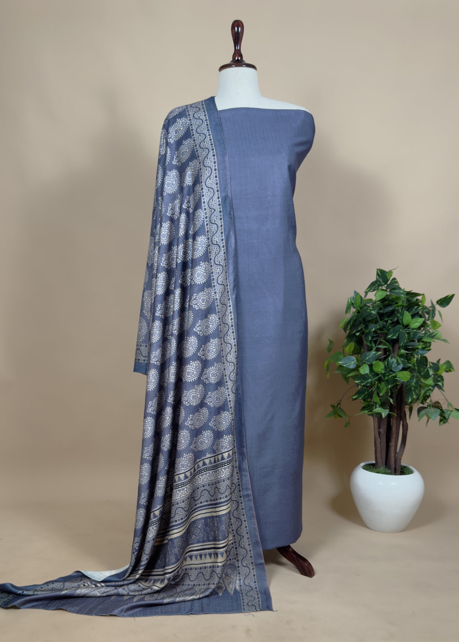 Monotone fine-quality pashmina unstitched three-piece suit set featuring plain pashmina kurta and pashmina lowers fabric paired with traditional dupatta having all-over paisley motifs for a visual delight.