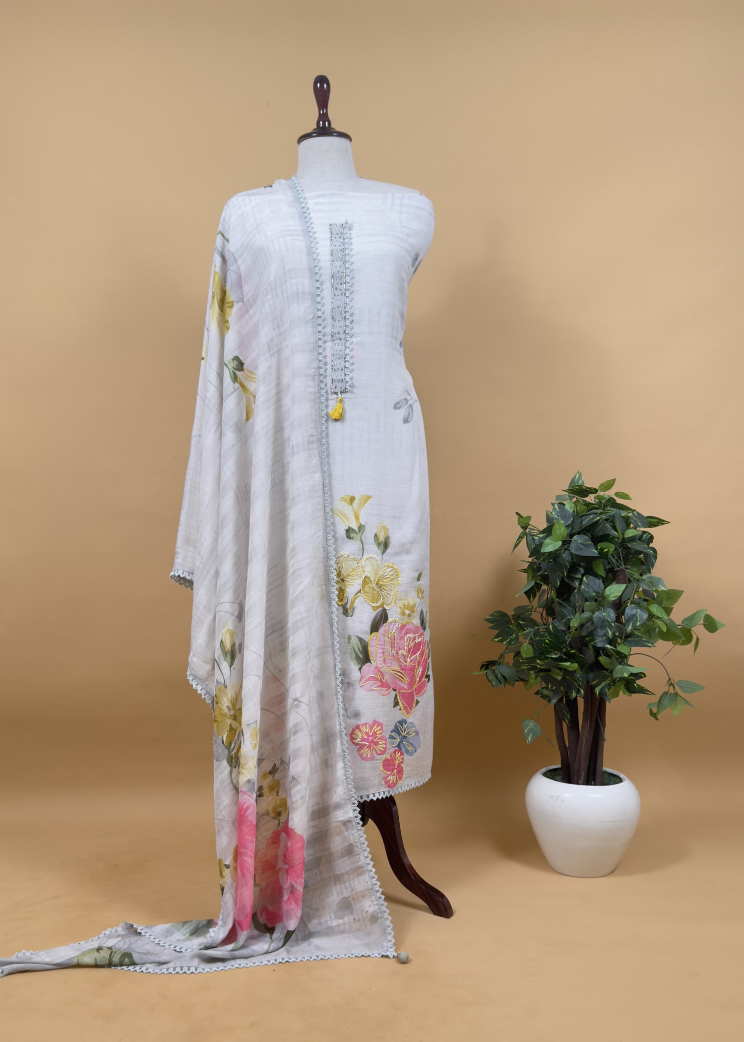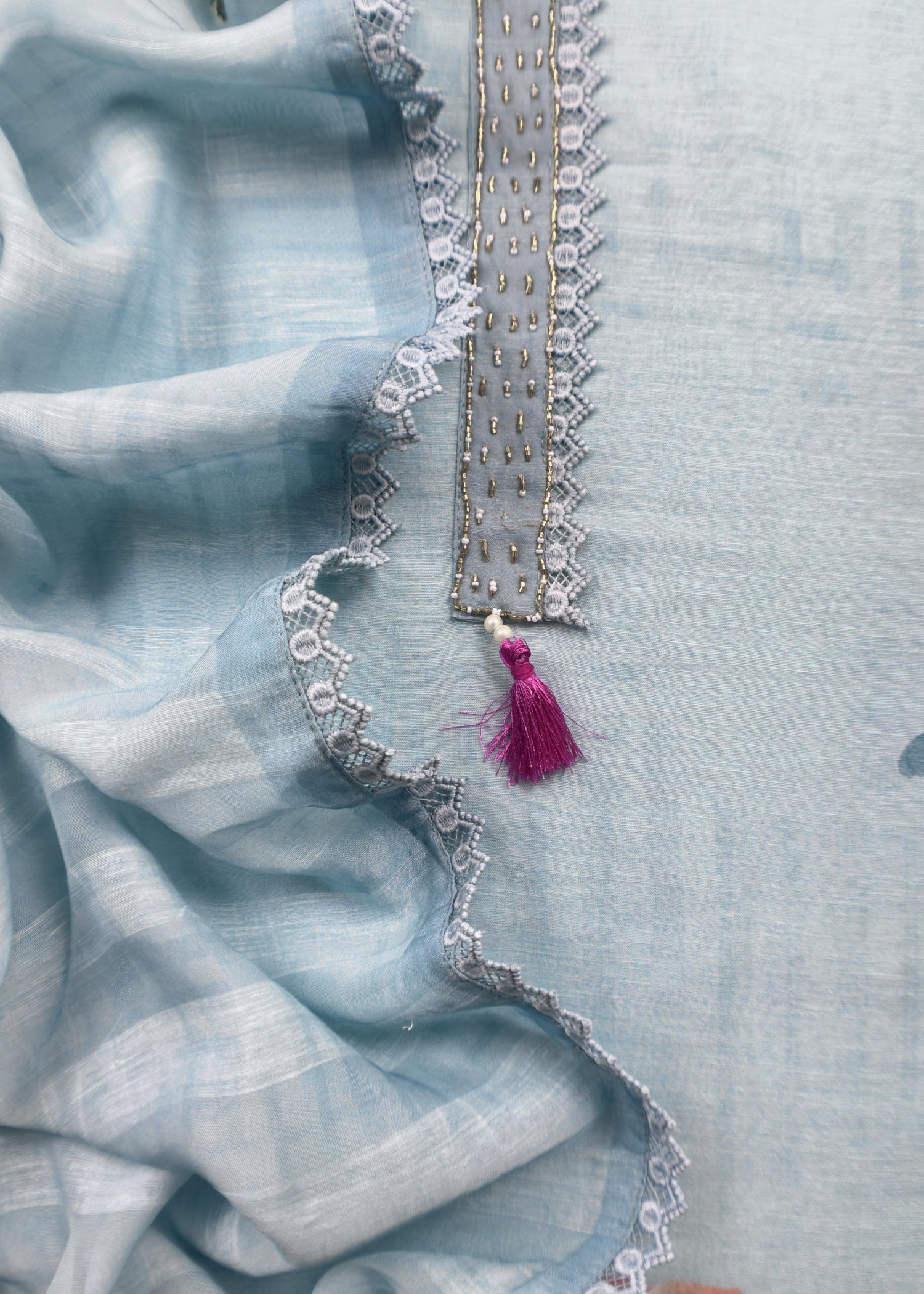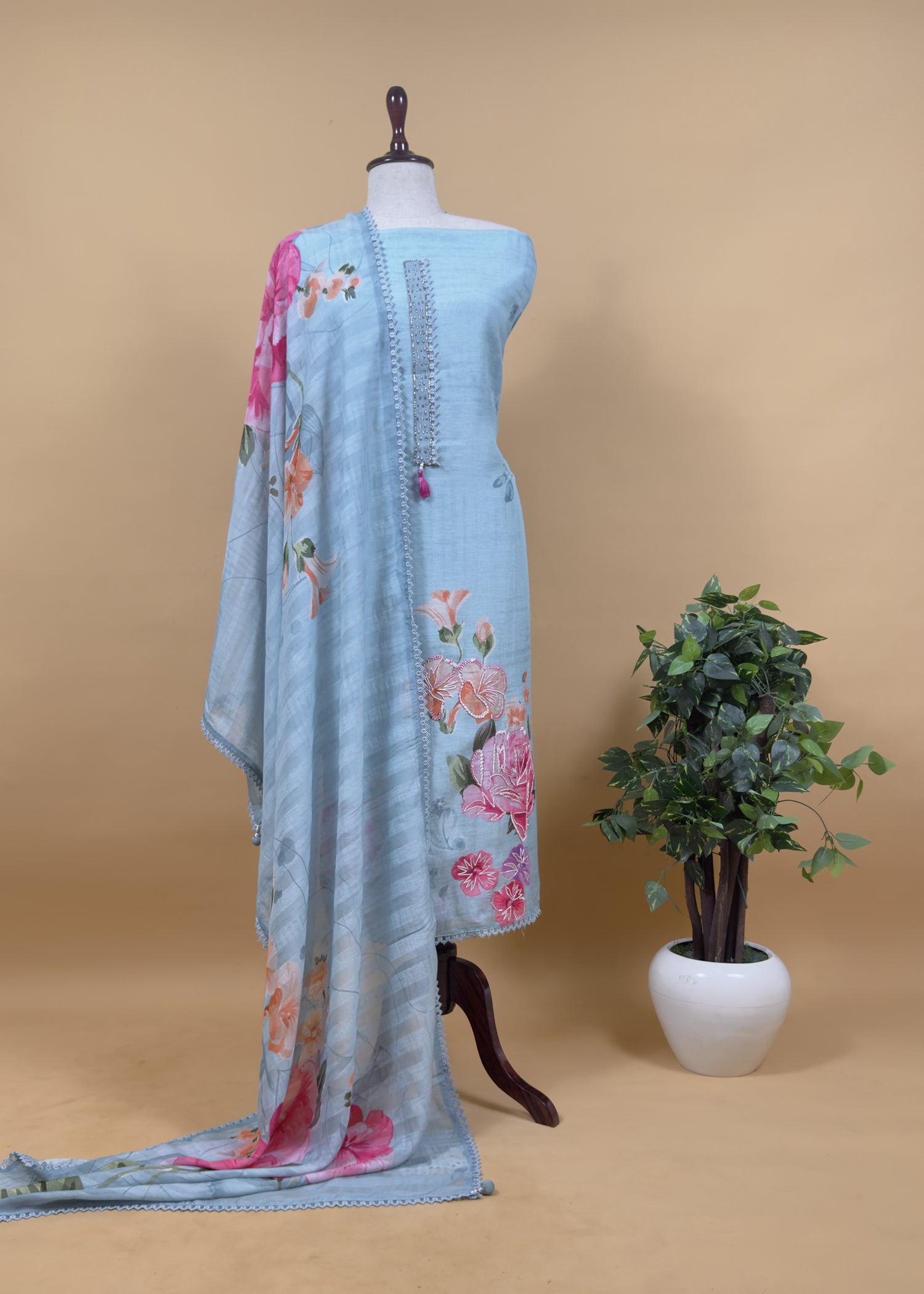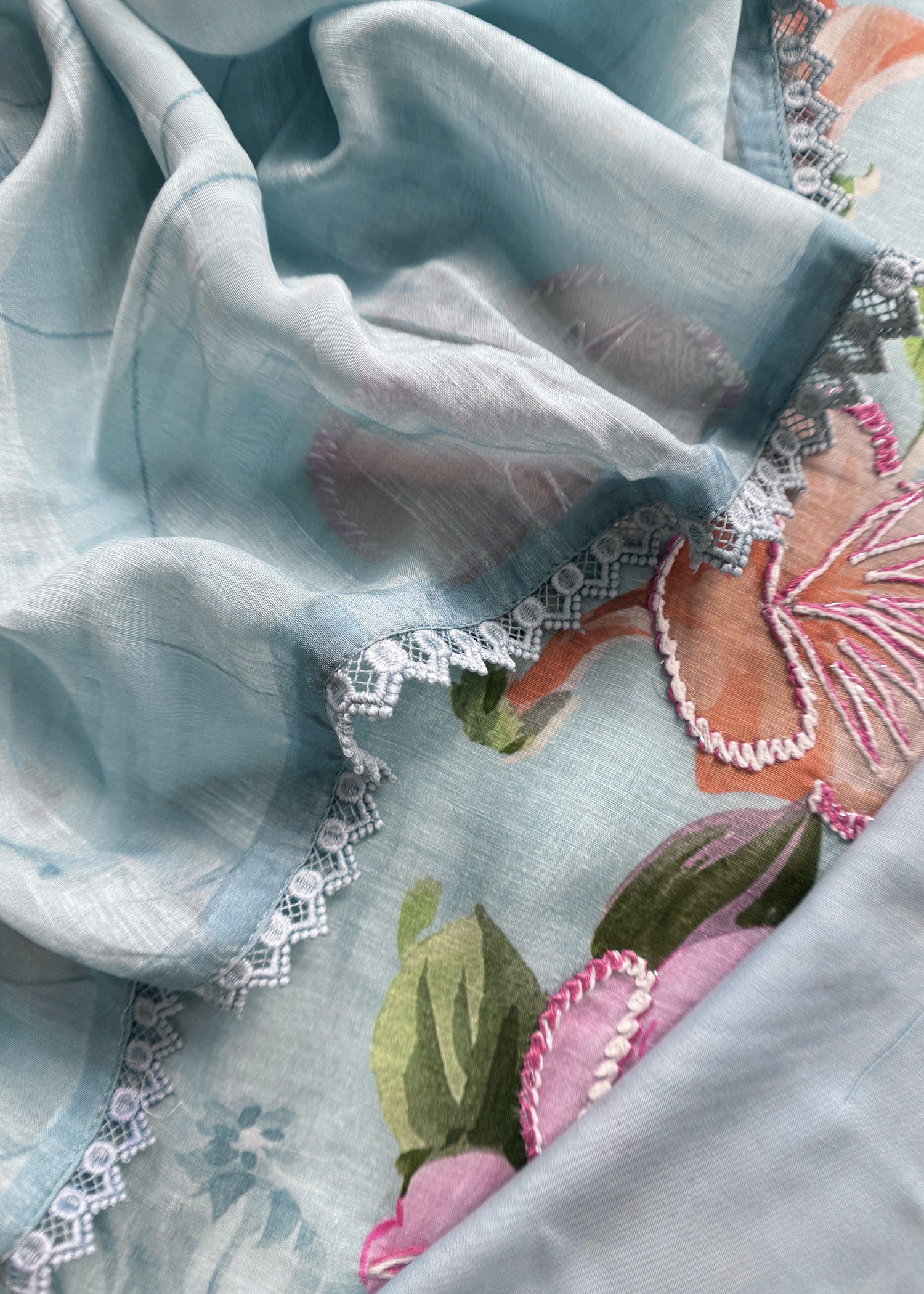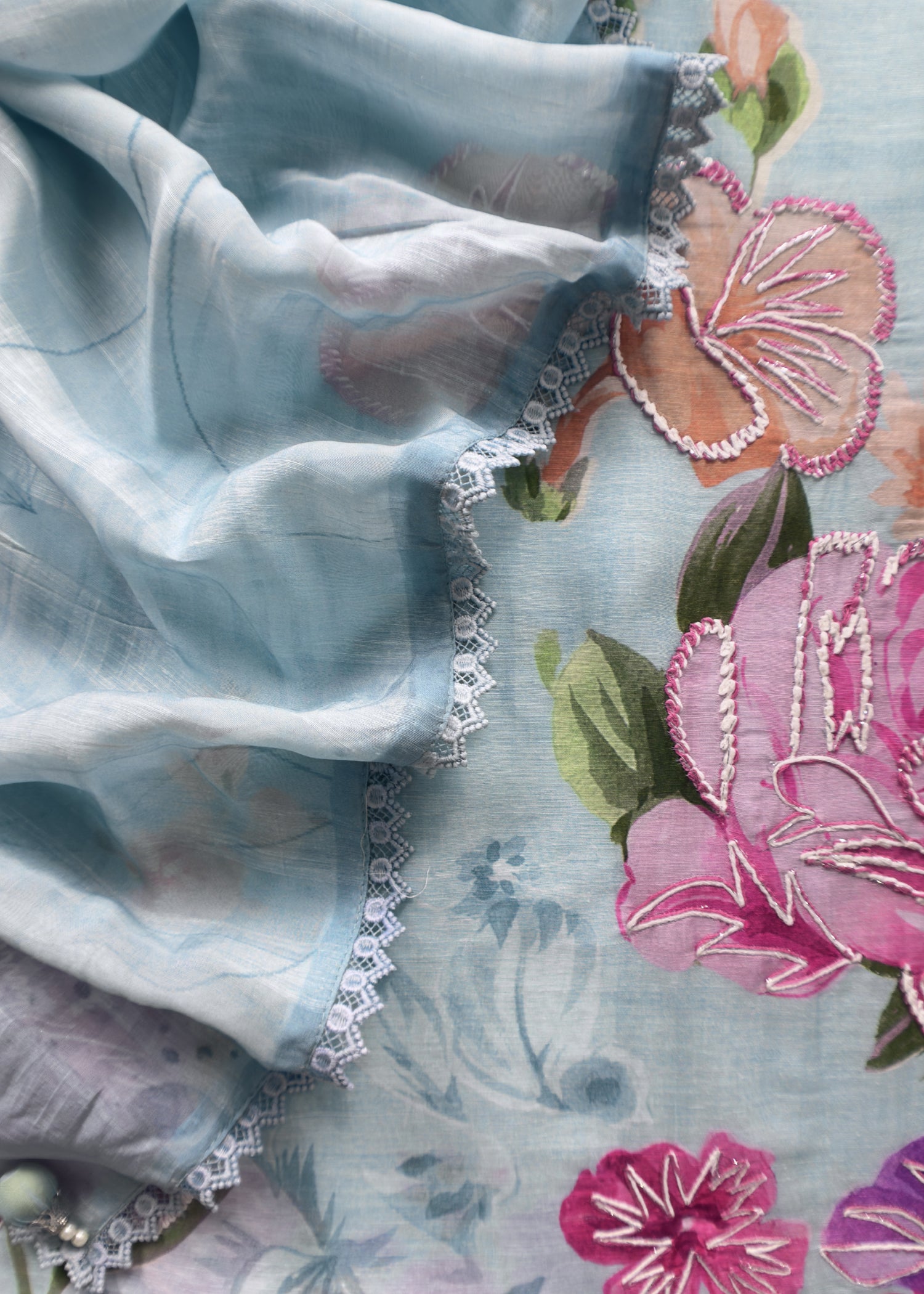 This pure mul cotton suit is adorned with hand-brushed thread embroidered flowers, adding a subtle elegance to its design. Featuring a beautifully detailed back and paired with a plain cotton bottom, this designer piece offers both style and comfort. Made from breathable mul cotton, it keeps you cool and comfortable while adding a touch of luxury to your everyday ethnic wear.