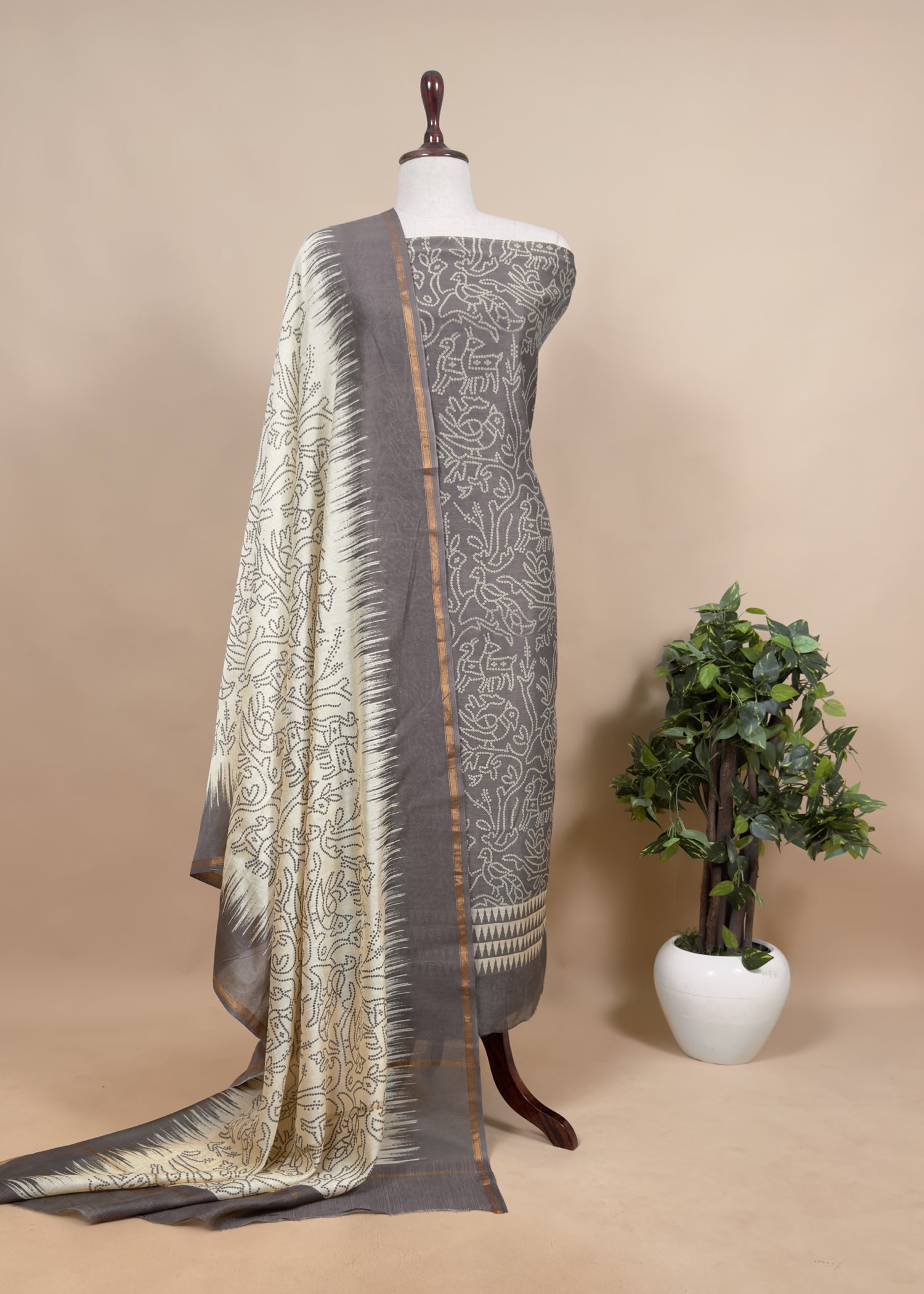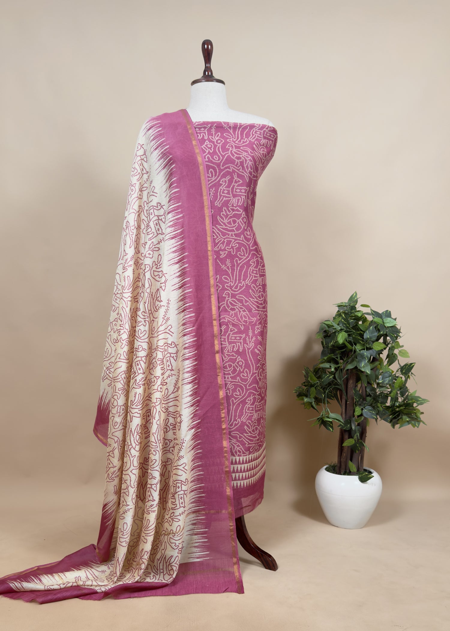 Presenting our bestseller unstitched three-piece suit set in handcrafted pure Maheshwari Silk fabric. The Maheshwari silk kurta features traditional bandh ani print all over it with paired with contrast Maheshwari Silk dupatta. The suit comes with fine quality cotton satin matching bottom.