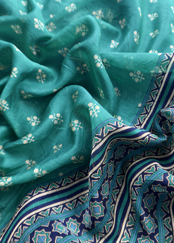Pure Maheshwari kurta and dupatta adorned with Shikagarh print are paired with plain matching satin cotton bottoms.
