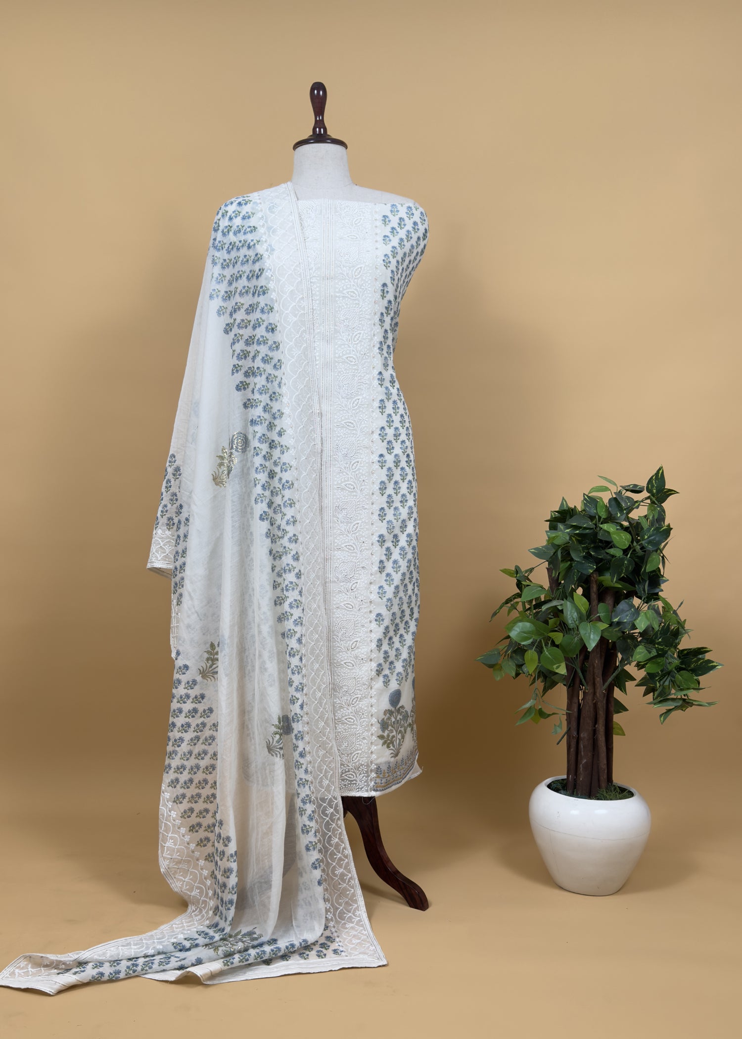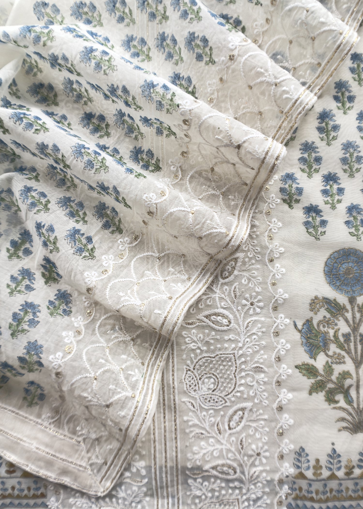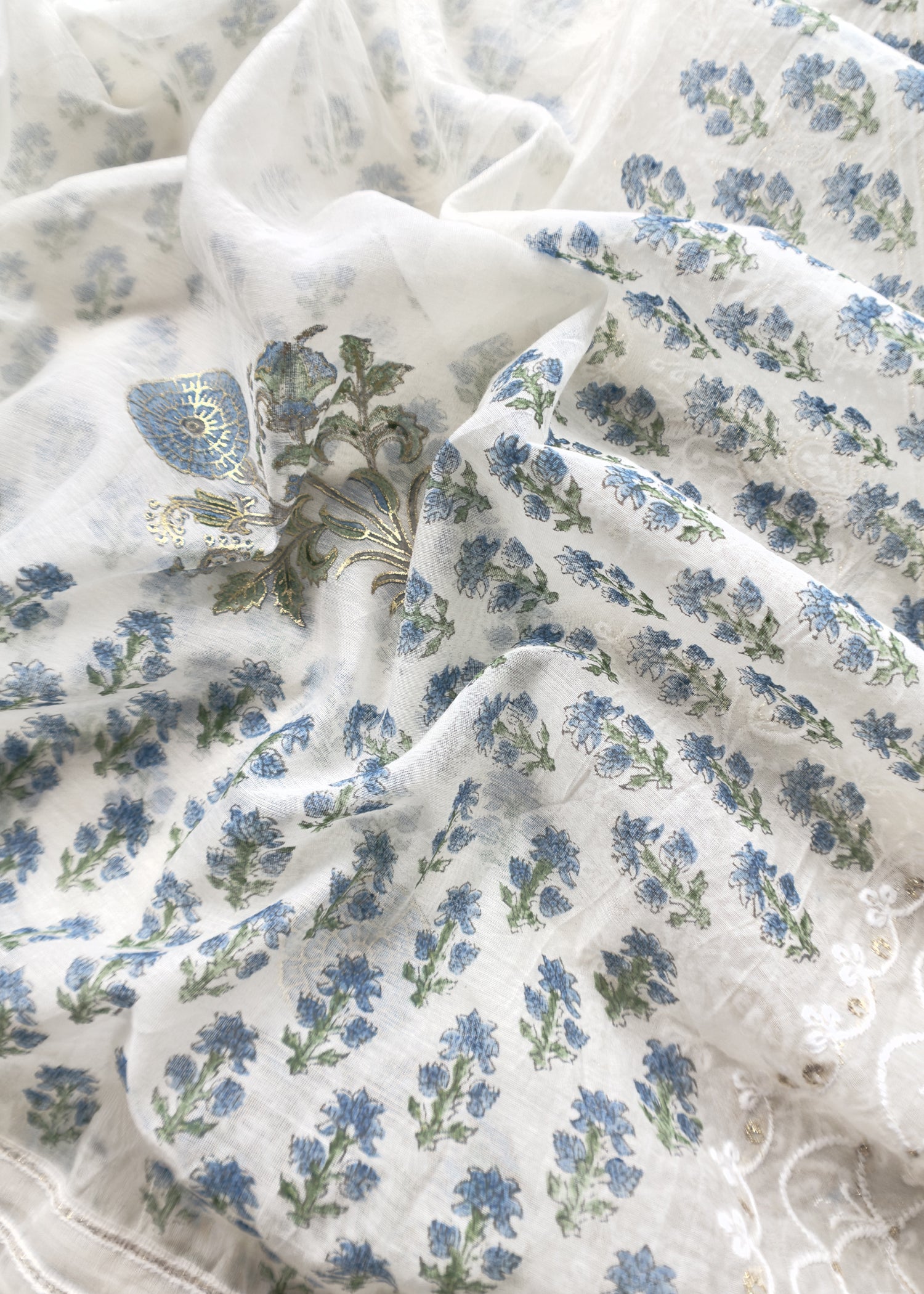 All over hand-block print kurta and dupatta in summer handloom mul fabric with beautiful white and gold embroidery detailings on the front panel of kurta and borders of dupatta. The three piece suit comes with matching cotton satin bottom.